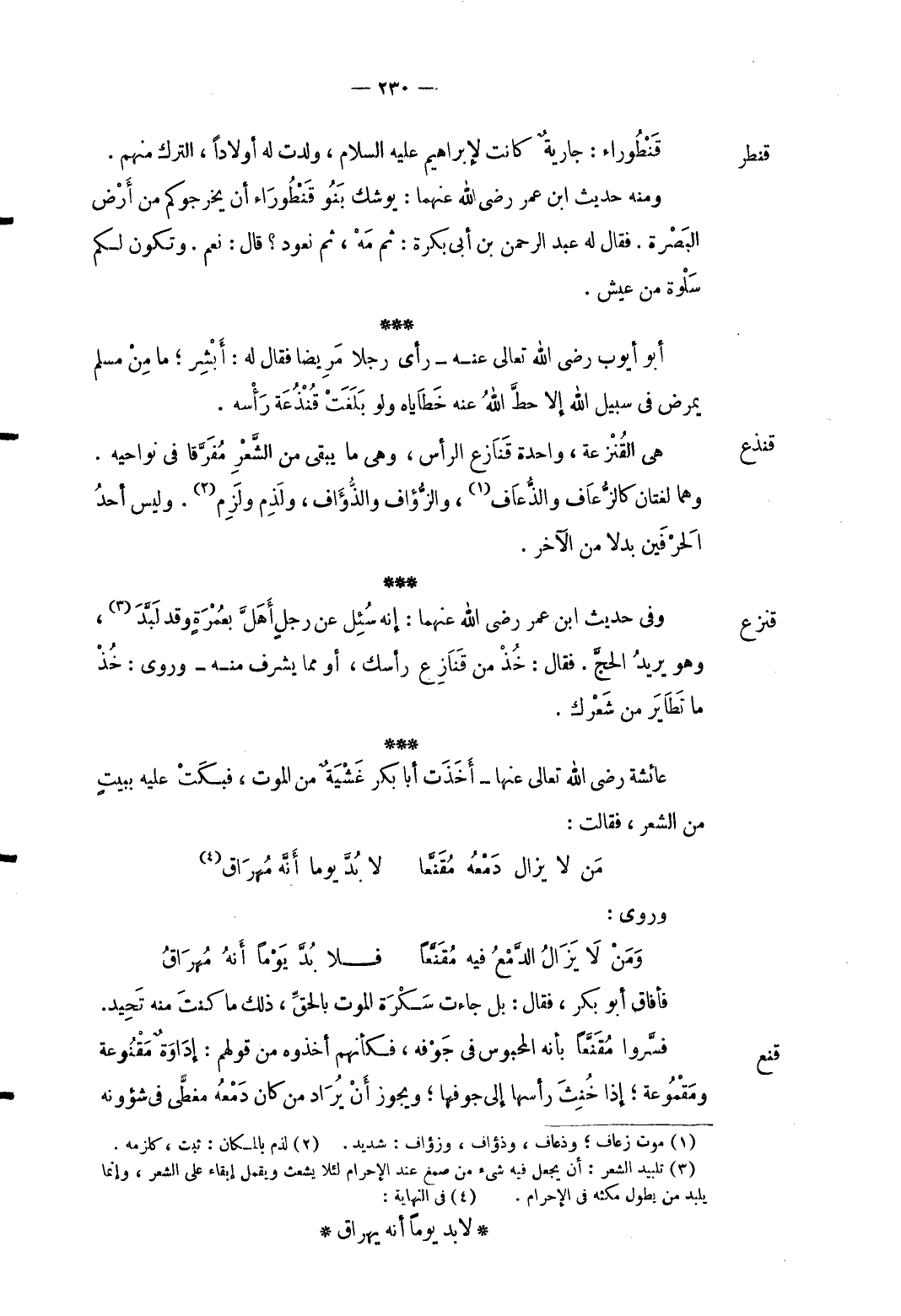 قنذع أَبُو أَيُّوب رَضِي الله تَعَالَى عَنهُ رأى رجلا مَرِيضا فَقَالَ لَهُ: أبشر مَا من مُسلم يمرض فِي سَبِيل الله إِلَّا حطَّ الله عَنهُ خطاياه وَلَو بلغت قنذعة رَأسه. هِيَ القنزعة وَاحِدَة قنازع الرَّأْس وَهِي مَا يبْقى من الشّعْر مفرَّقا فِي نواحيه. وهما لُغَتَانِ كالزعاف والذعاف والزؤاف والذؤاف ولذم وَلزِمَ. وَلَيْسَ أحد الحرفين بَدَلا من الآخر.