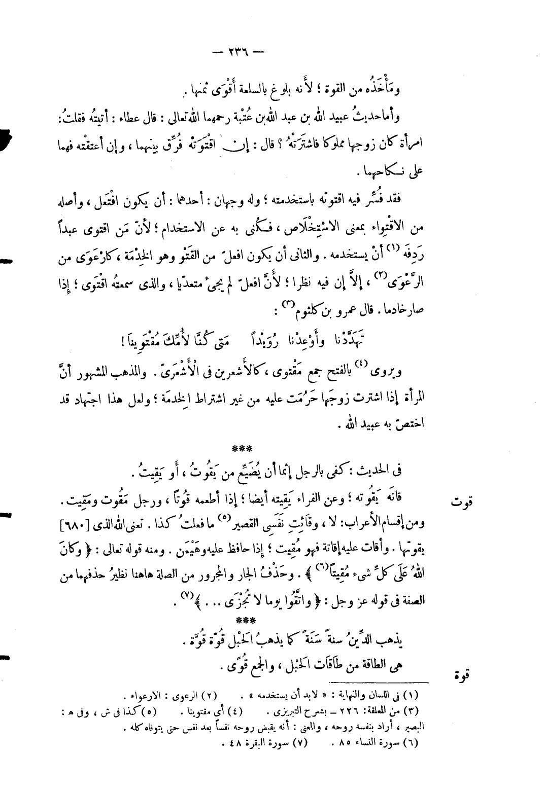 ومأخذه من الْقُوَّة لِأَنَّهُ بُلُوغ بالسلعة أقوى ثمنهَا. وَأما حَدِيث عبيد الله بن عبد الله بن عتبَة رحمهمَا الله تَعَالَى: قَالَ عَطاء: أَتَيْته فَقلت: امْرَأَة كَانَ زَوجهَا مَمْلُوكا فاشترته قَالَ: إِن اقتوته فُرِّق بَينهمَا وَإِن أَعتَقته فهما على نِكَاحهمَا. فقد فُسر فِيهِ اقتوته باستخدمته وَله وَجْهَان: أَحدهمَا: أَن يكون افتعل وَأَصله من الاقتواء بِمَعْنى الاستخلاص فكُني بِهِ عَن الِاسْتِخْدَام لِأَن من اقتوى عبدا ردفه أَن يستخدمه. وَالثَّانِي أَن يكون افْعَل من القتنو وَهُوَ الْخدمَة كارعوى من الرعوى إِلَّا أَن فِيهِ نظرا لِأَن افْعَل لم يَجِيء مُتَعَدِّيا وَالَّذِي سمعته اقتوى إِذا صَار خَادِمًا. قَالَ عَمْرو بن كُلْثُوم: ... تَهَدَّدْنا وأَوْعِدْنا رُوَيْداً ... مَتى كُنَّا لأُمِّكَ مُقْتَوِينَا ... ويروى بِالْفَتْح جمع مقتوي كالأشعرين فِي الْأَشْعَرِيّ. وَالْمذهب الْمَشْهُور أَن الْمَرْأَة إِذا اشترت زَوجهَا حرمت عَلَيْهِ من غير اشْتِرَاط الْخدمَة وَلَعَلَّ هَذَا اجْتِهَاد قد اخْتصَّ بِهِ عبيد الله.