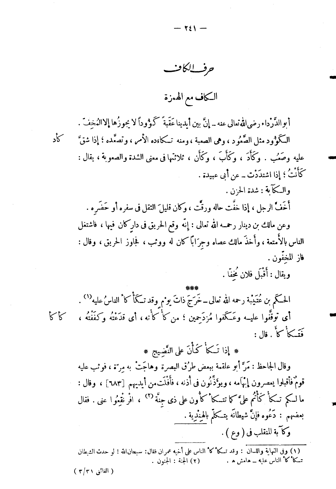 كأد أَبُو الدَّرْدَاء رَضِي الله تَعَالَى عَنهُ إِن بَين أَيْدِينَا عقبَة كؤودا لَا يجوزها إِلَّا المخف. الكؤود مثل الصعُود وَهِي الصعبة وَمِنْه تكاءده الْأَمر وتصَّعده إِذا شقَّ عَلَيْهِ وصعب. وكأد وكأب وَكَأن ثلاثتها فِي معنى الشدَّة والصعوبة يُقَال: كَأَنْت إِذا اشتددت عَن أبي عُبَيْدَة. والكآبة: شدَّة الْحزن. أخفَّ الرجل إِذا خفَّت حَاله ورقَّت وَكَانَ قَلِيل الثّقل فِي سَفَره أَو حَضَره. وَعَن مَالك بن دِينَار رَحمَه الله تَعَالَى: إِنَّه وَقع الْحَرِيق فِي دَار كَانَ فِيهَا فاشتغل النَّاس بالأمتعة وَأخذ مَالك عَصَاهُ وجراباً كَانَ لَهُ ووثب فجاوز الْحَرِيق وَقَالَ: فَازَ المخفون. وَيُقَال: أقبل لِأَن مخفا.