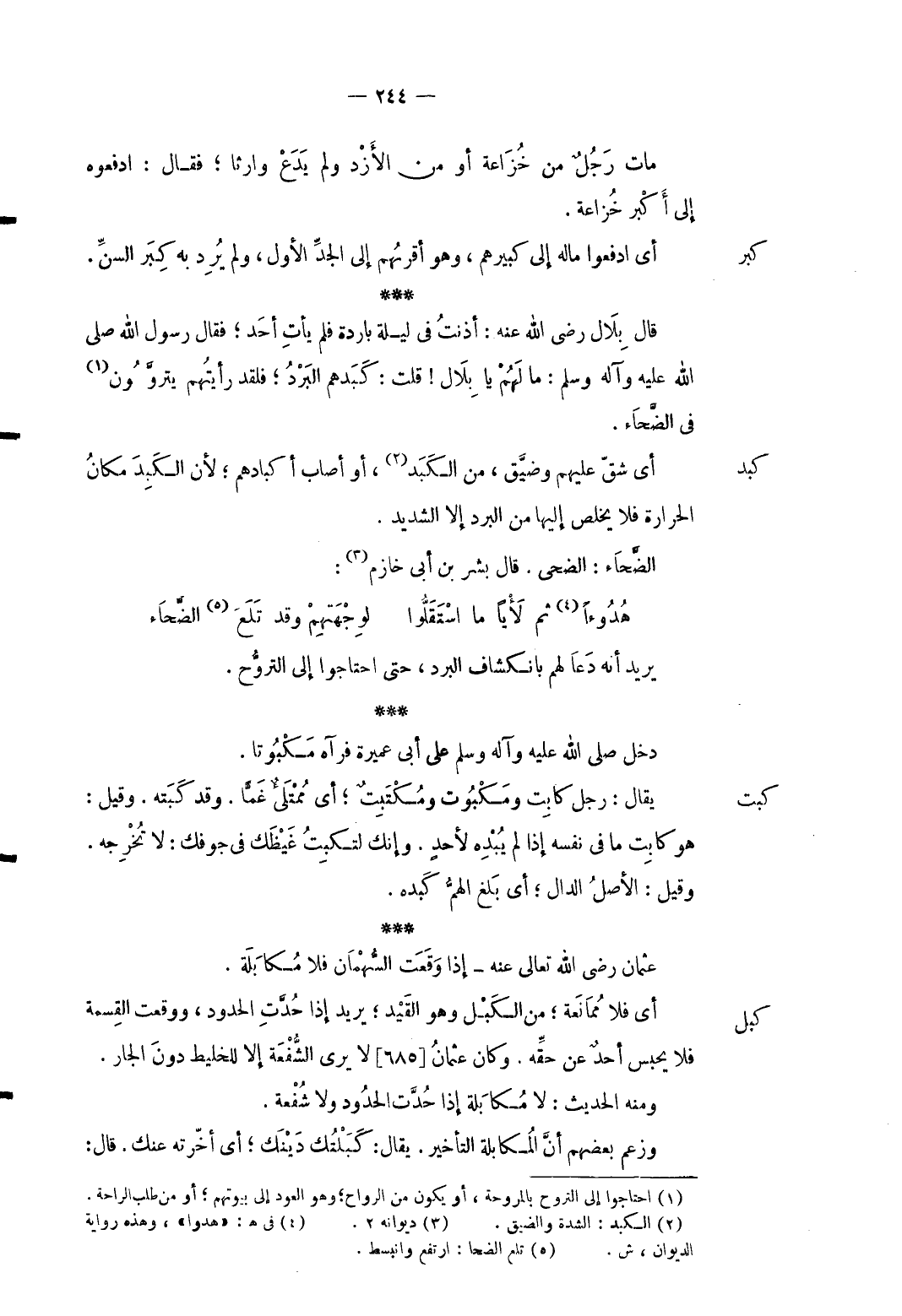 كبر مَاتَ رجل من خُزَاعَة أَو من الأزد وَلم يدع وَارِثا فَقَالَ: ادفعوه إِلَى أكبر خُزَاعَة. أَي ادفعوا مَاله إِلَى كَبِيرهمْ وَهُوَ أقربهم إِلَى الْجد الأول وَلم يرد بِهِ كبر السن.