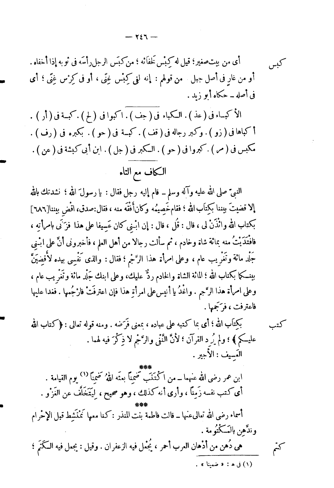 النَّبِي صلى الله عَلَيْهِ وَسلم قَامَ إِلَيْهِ رجل فَقَالَ: يَا رَسُول الله نشدتك بِاللَّه إِلَّا قضيت بَيْننَا بِكِتَاب الله فَقَامَ خصيمه وَكَانَ أفقه مِنْهُ فَقَالَ: صدق اقْضِ بَيْننَا بِكِتَاب الله وائذن لي قَالَ: قل قَالَ: إِن ابْني كَانَ عسيفا على هَذَا فزنى بامرأته فَافْتَدَيْت مِنْهُ بِمِائَة شَاة وخادم ثمَّ سَأَلت رجَالًا من أهل الْعلم فَأَخْبرُونِي أَن على ابْني جلد مائَة وتغريب عَام وعَلى امْرَأَة هَذَا الرَّجْم فَقَالَ: وَالَّذِي نَفسِي بِيَدِهِ لأقضين بَيْنكُمَا بِكِتَاب الله الْمِائَة الشَّاة وَالْخَادِم زد عَلَيْك وعَلى ابْنك جلد مائَة وتغريب عَام وعَلى امْرَأَة هَذَا الرَّجْم. واغد يَا أنيس على امْرَأَة هَذَا فَإِن اعْترفت فارجمها. فغدا عَلَيْهَا فَاعْترفت فرجمها. بِكِتَاب الله أَي بِمَا كتبه على عباده بِمَعْنى فَرْضه. وَمِنْه قَوْله تَعَالَى: {كتاب الله عَلَيْكُم} وَلم يُرد الْقُرْآن لِأَن النَّفْي وَالرَّجم لَا ذكر فِيهِ لَهما. العسيف: الْأَجِير. ابْن عمر رَضِي الله عَنْهُمَا من اكتتب ضمنا بَعثه الله ضمنا يَوْم الْقِيَامَة. أَي كتب نَفسه زَمنا وَأرى أَنه كَذَلِك وَهُوَ صَحِيح ليتخلف عَن الْغَزْو.