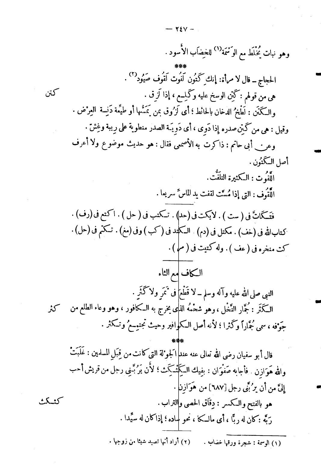 كثكث قَالَ أَبُو سُفْيَان رَضِي الله تَعَالَى عَنهُ عِنْد الجولة الَّتِي كَانَت من قبل الْمُسلمين: غلبت وَالله هوَازن. فَأَجَابَهُ صَفْوَان: بفيك الكثكث لِأَن يرُبَّني رجل من قُرَيْش أحب إليَّ من أَن يرُبَّني رجل من هوَازن. هُوَ بِالْفَتْح وَالْكَسْر: دقاق الْحَصَى وَالتُّرَاب. ربَّه: كَانَ لَهُ ربَّا أَي مَالِكًا نَحْو ساده إِذا كَانَ لَهُ سيدا.
