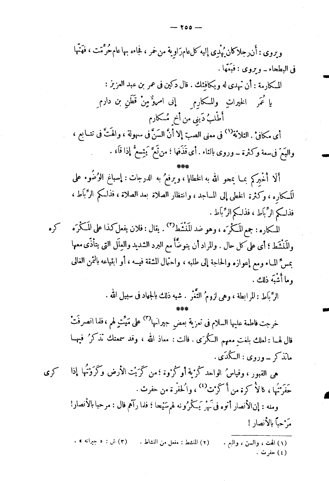 كره أَلا أخْبركُم بِمَا يمحو الله بِهِ الْخَطَايَا وَيرْفَع بِهِ الدَّرَجَات: إسباغ الْوضُوء على المكاره وَكَثْرَة الخطى إِلَى الْمَسَاجِد وانتظار الصَّلَاة بعد الصَّلَاة فذلكم الرِّباط فذلكم الرِّباط فذلكم الرِّباط. المكاره: جمع الْمُكْره وَهُوَ ضد المنشط. يُقَال: فلَان يفعل كَذَا على الْمُكْره والمنشط أَي على كل حَال. وَالْمرَاد أَن يتَوَضَّأ مَعَ الْبرد الشَّديد والعلل الَّتِي يتَأَذَّى مَعهَا بمسِّ المَاء وَمَعَ إعوازه وَالْحَاجة إِلَى طلبه وَاحْتِمَال الْمَشَقَّة فِيهِ أَو ابتياعه بِالثّمن الغالي وَمَا أشبه ذَلِك. الرِّباط: المرابطة وَهِي لُزُوم الثغر. شبه ذَلِك بِالْجِهَادِ فِي سَبِيل الله.