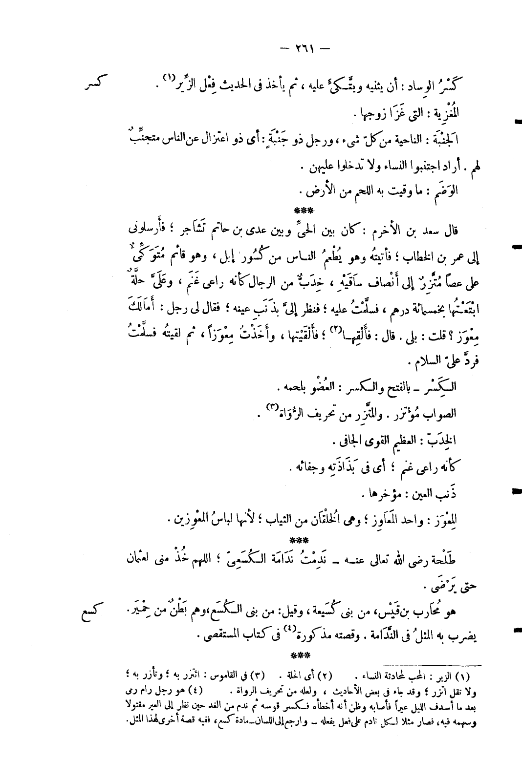 كسر كسر الوساد: أَن يثنيه ويتكئ عَلَيْهِ ثمَّ يَأْخُذ فِي الحَدِيث فعل الزير. المغزية: الَّتِي غزا زَوجهَا. الجنبة: النَّاحِيَة من كل شَيْء وَرجل ذُو جنبة: أَي ذُو اعتزال عَن النَّاس متجنب لَهُم. أَرَادَ اجتنبوا النِّسَاء وَلَا تدْخلُوا عَلَيْهِنَّ. الْوَضم: مَا وقيت بِهِ اللَّحْم من الأَرْض. قَالَ سعد بن الأخرم: كَانَ بَين الْحَيّ وَبَين عدي بن حَاتِم تشاجر فأرسلوني إِلَى عمر بن الْخطاب فَأَتَيْته وَهُوَ يطعم النَّاس من كسور إبل وَهُوَ قَائِم متوكئ على عَصا متزر إِلَى أَنْصَاف سَاقيه خدبٌّ من الرِّجَال كَأَنَّهُ راعي غنم وعليَّ حلَّة ابتعتها بِخَمْسِمِائَة دِرْهَم فسلَّمت عَلَيْهِ فَنظر إليَّ بذنب عينه فَقَالَ لي رجل: أمالك معوز قلت: بلَى. قَالَ: فَأَلْقِهَا فألقيتها وَأخذت معوزاً ثمَّ لَقيته فسلَّمت فردَّ عليَّ السَّلَام. الْكسر بِالْفَتْح وَالْكَسْر: الْعُضْو بِلَحْمِهِ. الصَّوَاب مؤتزر. والمتزر من تَحْرِيف الروَاة. الخدب: الْعَظِيم الْقوي الجافي. كَأَنَّهُ راعي غنم أَي فِي بذاذته وجفائه. ذَنْب الْعين: مؤخرها. المعوز: وَاحِد المعاوز وَهِي الخلقان من الثِّيَاب لِأَنَّهَا لِبَاس المعوزين.