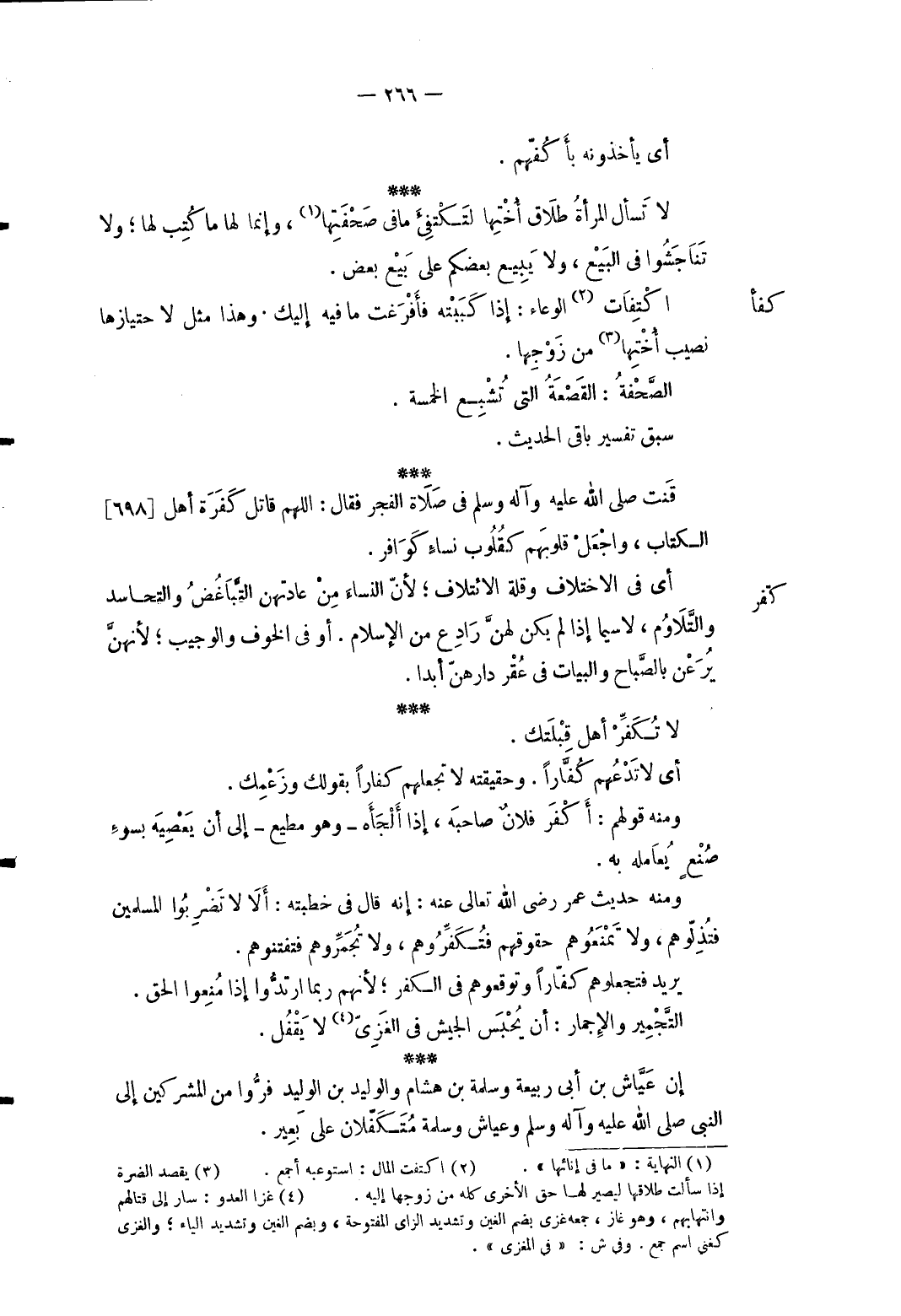 كفر قنت صلى الله عَلَيْهِ وَسلم فِي صَلَاة الْفجْر فَقَالَ: اللَّهُمَّ قَاتل كفرة أهل الْكتاب وَاجعَل قُلُوبهم كقلوب نساءٍ كوافر. أَي فِي الِاخْتِلَاف وَقلة الائتلاف لِأَن النِّسَاء من عادتهن التباغض والتحاسد والتلاوم لاسيما إِذا لم يكن لَهُنَّ رادع من الْإِسْلَام. أَو فِي الْخَوْف والوجيب لِأَنَّهُنَّ يُرعن بالصباح والبيات فِي عُقر دارهن أبدا. لَا تُكفِّرْ أهل قبلتك. أَي لَا تَدعهُمْ كفَّارًا. وَحَقِيقَته لَا تجعلهم كفَّارًا بِقَوْلِك وزعمك. وَمِنْه قَوْلهم: أكفر فلَان صَاحبه إِذا أَلْجَأَهُ وَهُوَ مُطِيع إِلَى أَن يعصيه بِسوء صُنع يُعامله بِهِ. وَمِنْه حَدِيث عمر رَضِي الله تَعَالَى عَنهُ: إِنَّه قَالَ فِي خطبَته: أَلا لَا تضربوا الْمُسلمين فتذلوهم وَلَا تمنعوهم حُقُوقهم فتكفِّروهم وَلَا تُجمِّروهم فتفتنوهم. يُرِيد فتجعلوهم كفَّارًا وتوقعوهم فِي الْكفْر لأَنهم رُبمَا ارْتَدُّوا إِذا مُنعوا الْحق. التجمير والإجمار. أَن يُحبس الْجَيْش فِي الْغَزِّي لَا يقفل.