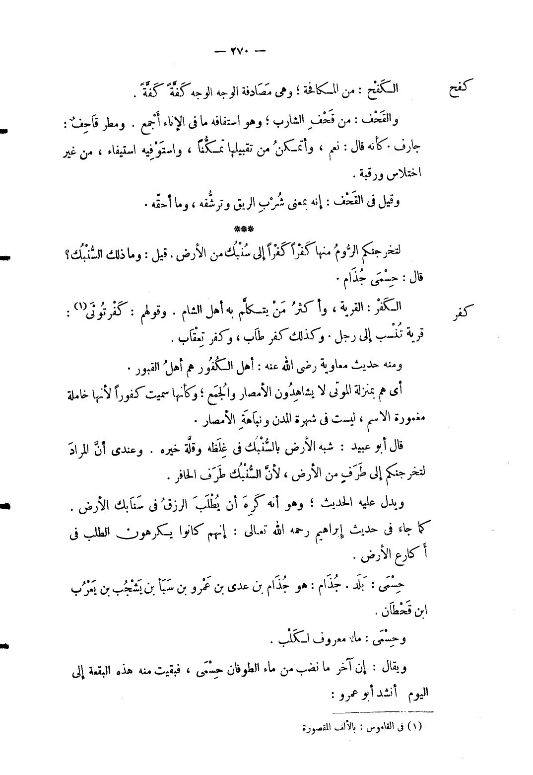 كفر لتخرجنكم الرّوم مِنْهَا كفرا كفرا إِلَى سنبك من الأَرْض. قيل: وَمَا ذَلِك السنبك قَالَ: حسمى جذام. الْكفْر: الْقرْيَة وَأكْثر من يتَكَلَّم بِهِ أهل الشَّام. وَقَوْلهمْ: كفرتوثي: قَرْيَة تنْسب إِلَى رجل. وَكَذَلِكَ كفرطاب وكفرتعقاب. وَمِنْه حَدِيث مُعَاوِيَة رَضِي الله عَنهُ: أهل الكفور هم أهل الْقُبُور. أَي هم بِمَنْزِلَة الْمَوْتَى لَا يشاهدون الْأَمْصَار وَالْجمع وَكَأَنَّهَا سميت كفوراً لِأَنَّهَا خاملة مغمورة الِاسْم لَيست فِي شهرة المدن ونباهة الْأَمْصَار. قَالَ أَبُو عبيد: شبه الأَرْض بالسنبك فِي غلظه وَقلة خَيره. وَعِنْدِي أَن المُرَاد لتخرجنكم إِلَى طرف من الأَرْض لِأَن السنبك طرف الْحَافِر. وَيدل عَلَيْهِ الحَدِيث وَهُوَ أَنه كره أَن يطْلب الرزق فِي سنابك الأَرْض. كَمَا جَاءَ فِي حَدِيث إِبْرَاهِيم رَحمَه الله تَعَالَى: إِنَّهُم كَانُوا يكْرهُونَ الطّلب فِي أكارع الأَرْض. حسمي: بلد. جذام أم جذام بن عدي بن عَمْرو بن سبأ بن يشجب بن يعرب ابْن قحطان. وحسمى: مَاء مَعْرُوف لكَلْب. وَيُقَال: إِن آخر مَا نضب من مَاء الطوفان حسمى فَبَقيت مِنْهُ هَذِه الْبقْعَة إِلَى الْيَوْم أنْشد أَبُو عَمْرو: