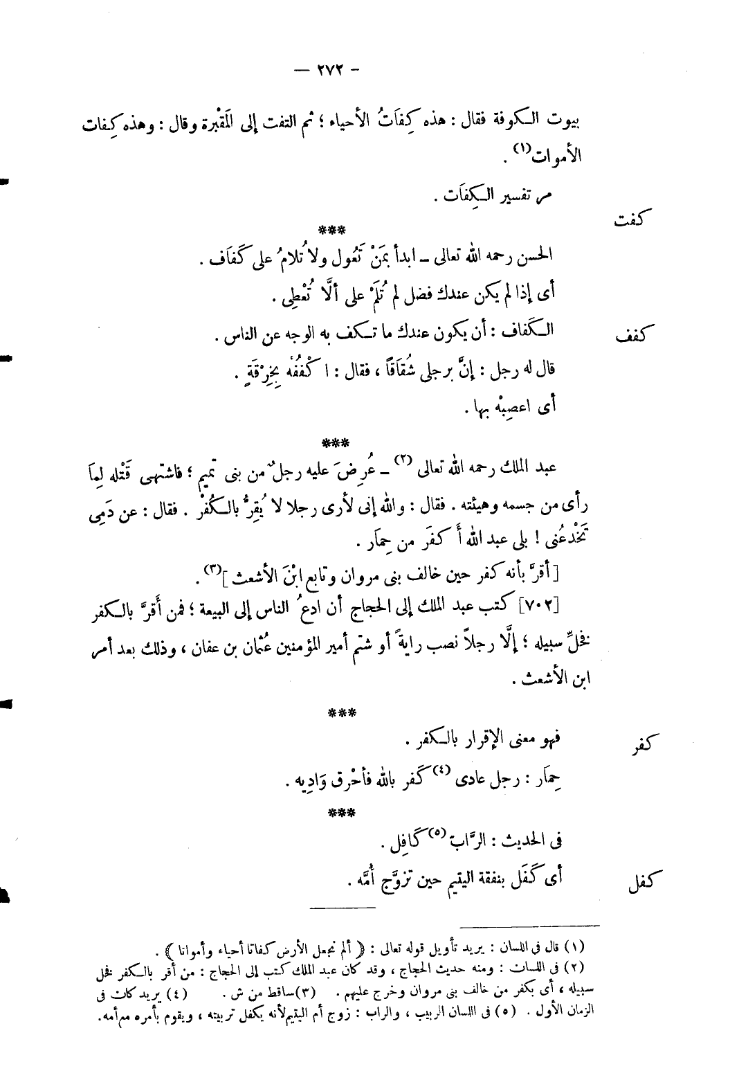 كفف الْحسن رَحمَه الله تَعَالَى ابدأ بِمن تعول وَلَا تلام على كفاف. أَي إِذا لم يكن عنْدك فضل لم تلم على أَلا تُعطي. الكفاف: أَن يكون عنْدك مَا تكف بِهِ الْوَجْه عَن النَّاس. قَالَ لَهُ رجل: إِن برجلي شقاقاً فَقَالَ: اكففه بِخرقَة. أَي اعصبه بهَا. عبد الْملك رَحمَه الله تَعَالَى عُرض عَلَيْهِ رجل من بني تَمِيم فاشتهى قَتله لما رأى من جِسْمه وهيئته. فَقَالَ: وَالله إِنِّي لأرى رجلا لَا يقر بالْكفْر. فَقَالَ: عَن دمي تخدعني بلَى عبد الله أكفر من حمَار. [أقرَّ بِأَنَّهُ كفر حِين خَالف بني مَرْوَان وتابع ابْن الْأَشْعَث] . كتب عبد الْملك إِلَى الْحجَّاج أَن أدع النَّاس إِلَى الْبيعَة فَمن أقرّ بالْكفْر فخلِّ سَبيله إِلَّا رجلا نصب راية أَو شتم أَمِير الْمُؤمنِينَ عُثْمَان بن عَفَّان وَذَلِكَ بعد أَمر ابْن الْأَشْعَث.