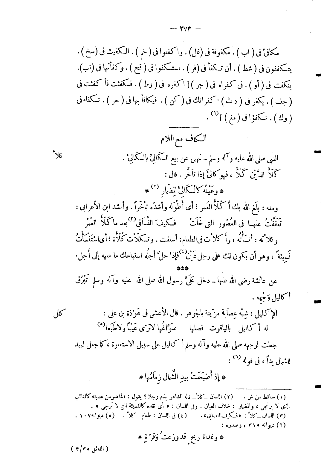 كلأ النَّبِي صلى الله عَلَيْهِ وَسلم نهى عَن بيع الكالئ بالكالئ. كلأ الدّين كلأ فَهُوَ كالئٌ إِذا تأخرَّ. قَالَ: ... وعَيْنُه كالْكَالِئِ المِضْمارِ ... وَمِنْه: بلغ الله بك أكلأ الْعُمر أَي أطوله وأشده تأخراً. وَأنْشد ابْن الْأَعرَابِي: ... تَعَفَّفْتُ عَنْهَا فِي العُصُور الَّتِي خَلَتْ ... فَكيف التَّسَاقِي بعد مَا كَلأَ العُمْر ... وكلأته: أنسأته وأكلأت فِي الطَّعَام: أسفلت. وتكلأت كلأة أَي استنسأت نَسِيئَة وَهُوَ أَن يكون لَك على رجل دين فَإِذا حلَّ أَجله استباعك مَا عَلَيْهِ إِلَى أجل.