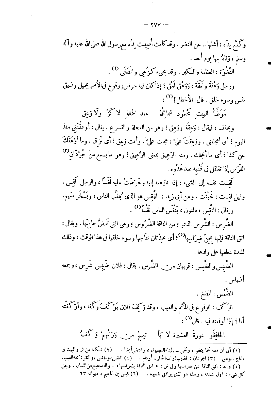 وكنع يَده: أشلها عَن النَّضر. وَقد كَانَت أُصيبت يَده مَعَ رَسُول الله صلى الله عَلَيْهِ وَسلم وَقَاه بهَا يَوْم أُحد. النخوة: العظمة وَالْكبر. وَقد يَجِيء كزهى وانتخى. وَرجل وعقة ولعقة ووعق لعق إِذا كَانَ فِيهِ حرص وَوُقُوع فِي الْأَمر بِجَهْل وضيق نفس وَسُوء خلق. قَالَ [الأخطل] : ... مَوَطَّأُ البيتِ مَحْمُود شمائِلُهُ ... عِنْد الحمالةِ لاكَزّ ولاَ وَعِق ... ويخفف / فَيُقَال: وعقة ووعق وَهُوَ من العجلة والتسرع. يُقَال: أوعقتني مُنْذُ الْيَوْم أَي أعجلتني. ووعقت عليّ: عجلت عليّ. وَأَنت وعق أَي نزق. وَمَا أوعقك عَن كَذَا أَي مَا أعجلك. وَمِنْه الوعيق بِمَعْنى الرَّعيق وَهُوَ مَا يسمع من جردان الْفرس إِذا تقلقل فِي قنبه عِنْد عدوه. لقست نَفسه الى الشَّيْء: إِذا نازعته إلله وحرصت عَلَيْهِ لقساً وَالرجل لقس: وَقيل لقست: خبثت. وَعَن أبي زيدة: اللقس هُوَ الَّذِي يُلقِّب النَّاس ويسخر مِنْهُم. وَيُقَال: النقس بالنُّون ينقس النَّاس نقساً. الضَّرس: الشَّرس الذعر من النَّاقة الضروس وَهِي الَّتِي تعض حالبها. وَيُقَال: اتَّقِ النَّاقة فَإِنَّهَا بجنّ ضراسها أَي بحدثان نتاجها وَسُوء خلقهَا فِي هَذَا الْوَقْت وَذَلِكَ لشدَّة عطفها على وَلَدهَا. الضبس والضمس: قريبان من الضَّرس. يُقَال: فلَان ضبس شرس وَجمعه أضباس. الضمس: المضغ. الوكف: الْوُقُوع فِي المأثم وَالْعَيْب وَقد وكف فلَان يوكف وكفا وأوكفته أَنا إِذا أوقعته فِيهِ. قَالَ: ... الحافِظُو عورةَ الْعَشِيرَة لَا يَأ ... تيهِمُ من وَرَائهمْ وَكَفُ ...
