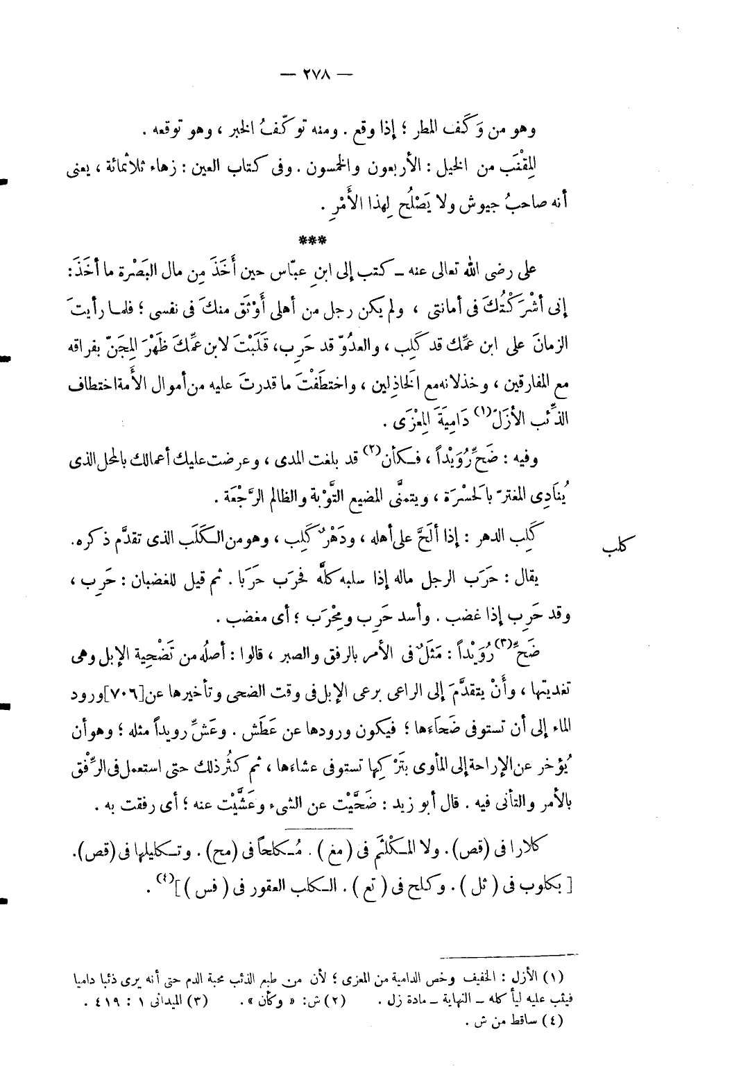 كلب عَليّ رَضِي الله تَعَالَى عَنهُ كتب إِلَى ابْن عَبَّاس حِين أَخذ من مَال الْبَصْرَة مَا أَخذ: إِنِّي أَشْرَكتك فِي أمانتي وَلم يكن رجل من أَهلِي أوثق مِنْك فِي نَفسِي فَلَمَّا رَأَيْت الزَّمَان على ابْن عمك قد كلب والعدو قد حَرْب قلبت لِابْنِ عمك ظهر الْمِجَن بِفِرَاقِهِ مَعَ المفارقين وخذلانه مَعَ الخاذلين واختطفت مَا قدرت عَلَيْهِ من أَمْوَال الْأمة اختطاف الذِّئْب الْأَزَل دامية الْعُزَّى. وَفِيه ضحِّ رويداً فَكَأَن قد بلغت المدى وَعرضت عَلَيْك أعمالك بِالْمحل الَّذِي يُنَادي المغتر بالحسرة ويتمنى المضيع التَّوْبَة والظالم الرّجْعَة. كلب الدَّهْر: إِذا ألحَّ على أَهله ودهر كلب وَهُوَ من الْكَلْب الَّذِي تقدم ذكره يُقَال: حَرْب الرجل مَاله إِذا سلبه كُله فحرب حَربًا. ثمَّ قيل للغضبان: حَرْب وَقد حَرْب إِذا غضب. وَأسد حَرْب ومحرب أَي مغضب. ضحِّ رويداً: مثلٌ فِي الْأَمر بالرفق وَالصَّبْر قَالُوا: أَصله من تضحية الْإِبِل وَهِي تغديتها وَأَن يتَقَدَّم إِلَى الرَّاعِي برعي الْإِبِل فِي وَقت الضُّحَى وتأخيرها عَن وُرُود المَاء إِلَى أَن تستوفى ضحاءها فَيكون وُرُودهَا عَن عَطش. وعش رويدا مثل وَهُوَ أَن يُؤَخر عَن الإراحة إِلَى المأوى بِتَرْكِهَا تستوفى عشاءها ثمَّ كثر ذَلِك حَتَّى اسْتعْمل فِي الرِّفق بِالْأَمر والتأني فِيهِ. قَالَ أَبُو زيد: ضحَّيت عَن الشَّيْء وعشَّيت عَنهُ أَي رفقت بِهِ.