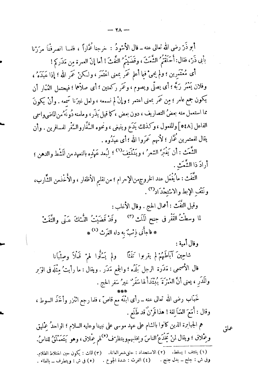 أَبُو ذَر رَضِي الله تَعَالَى عَنهُ قَالَ الْأسود خرجنَا عماراً فَلَمَّا انصرفنا مَرَرْنَا بِأبي ذَر فَقَالَ أحلقتم الشعث وقضيتم التفث أما إِن الْعمرَة من مدركم أَي معتمرين وَلم يَجِيء فِيمَا فِيمَا أعلم عمر بِمَعْنى اعْتَمر وَلَكِن عمر الله إِذا عَبده وَفُلَان يعمر ربه أَي يُصَلِّي ويصوم وَعمر رَكْعَتَيْنِ أَي صلاهما فَيحْتَمل الْعمار أَن يكون جمع عَامر من عمر بِمَعْنى اعْتَمر وَإِن لم نَسْمَعهُ وَلَعَلَّ غَيرنَا سَمعه وَأَن يكون مِمَّا اسْتعْمل مِنْهُ بعض التصاريف دون بعض كَمَا قيل يذر وَمَا مِنْهُ دونه من الْمَاضِي واسمى الْفَاعِل وَالْمَفْعُول وَكَذَلِكَ يدع وَيَنْبَغِي وَنَحْوه السفار وَالسّفر للمسافرين وَأَن يُقَال للمعتمرين عمَّار لأَنهم عمروا الله أَي عبدوه. الشَّعث أَن يغبر الشّعْر وينتتف لبعد عَهده بالتعهد من الْمشْط والدهن أَرَادَ ذَا الشعث. التَّفث: مَا يفعل عِنْد الْخُرُوج من الْإِحْرَام من تقليم الْأَظْفَار وَالْأَخْذ من الشَّارِب ونتف الْإِبِط والاستحداد. وَقيل التفث: أَعمال الْحَج وَقَالَ الْأَغْلَب: ... لما وسطْتُ القَفْر فِي جنح المَلَث ... وقَدْ قَضَيْتُ النُّسْكَ: عني والفث