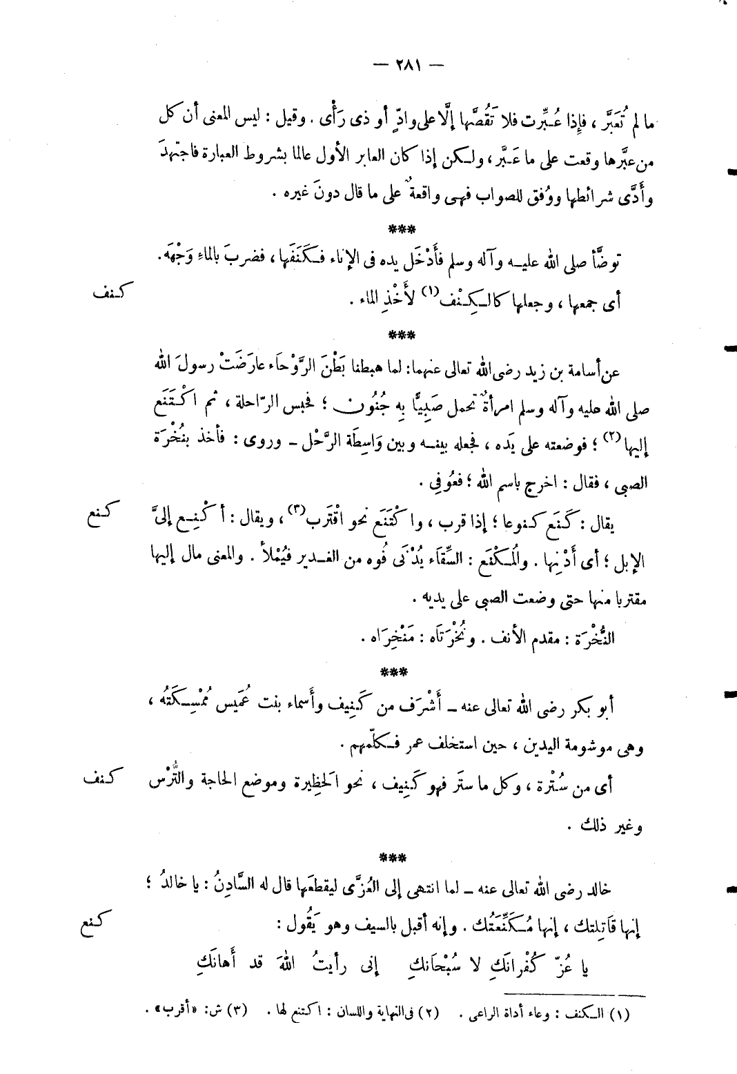 كنع عَن أُسَامَة بن زيد رَضِي الله تَعَالَى عَنْهُمَا: لما هبطنا بطن الروحاء عارضت رَسُول الله صلى الله عَلَيْهِ وَسلم امْرَأَة تحمل صبياًّ بِهِ جُنُون فحبس الرَّاحِلَة ثمَّ اكتنع إِلَيْهَا فَوَضَعته على يَده فَجعله بَينه وَبَين وَاسِطَة الرَّحل وروى: فَأخذ بنخرة الصَّبِي فَقَالَ: اخْرُج باسم الله فَعُوفِيَ. يُقَال: كنع كنوعا إِذا قرب واكتنع نَحْو اقْترب وَيُقَال: أكنع إليَّ الْإِبِل أَي أدنها. والمُكنع: السقاء بدني فوه من الغدير فَيمْلَأ. وَالْمعْنَى مَال إِلَيْهَا مقتربا مِنْهَا حَتَّى وضعت الصَّبِي على يَدَيْهِ. النخرة: مقدم الْأنف. ونخرتاه: منخراه.