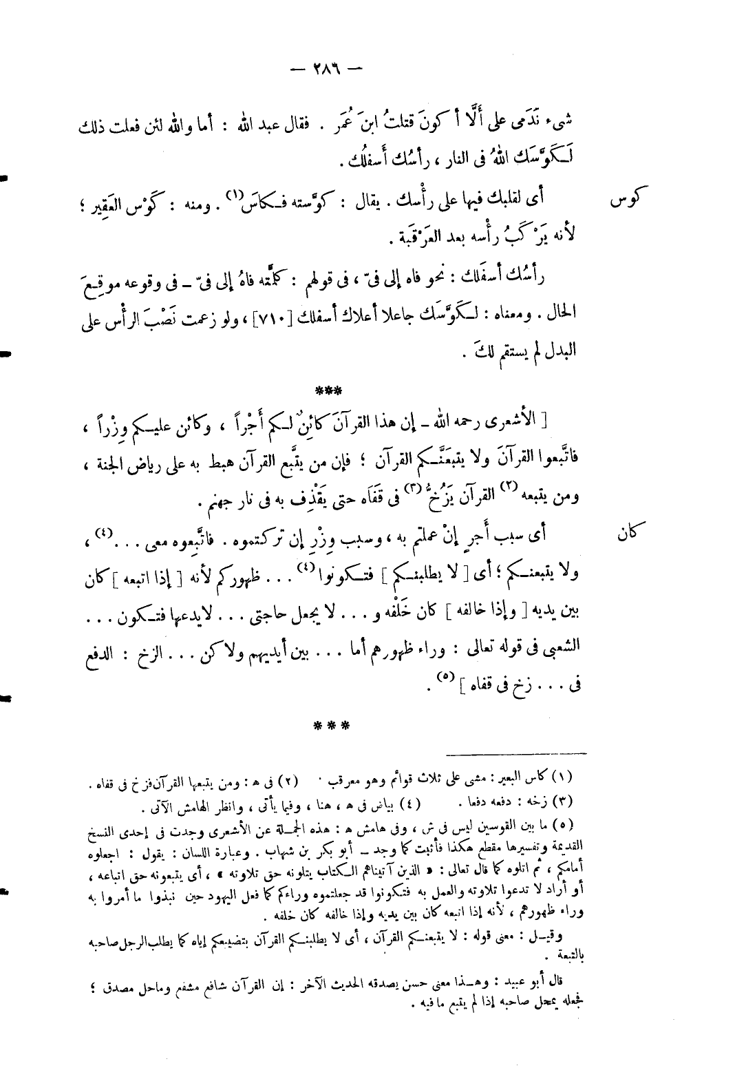 كَانَ الْأَشْعَرِيّ رَحمَه الله إِن هَذَا الْقُرْآن كَائِن لكم أجرا وكائن عَلَيْكُم وزراً فاتَّبعوا الْقُرْآن وَلَا يتبعنكم الْقُرْآن فَإِن من يتَّبع الْقُرْآن هَبَط بِهِ على رياض الْجنَّة وَمن يتبعهُ الْقُرْآن يزخُّ فِي قَفاهُ حَتَّى يقذف بِهِ فِي نَار جَهَنَّم. أَي سَبَب أجرٍ إِن عملتم بِهِ وَسبب وزر إِن تَرَكْتُمُوهُ. فاتَّبِعوه معي. . وَلَا يتبعنكم أَي [لَا يطلبنكم] فتكونوا. . ظهوركم لِأَنَّهُ [إِذا اتبعهُ] كَانَ بَين يَدَيْهِ [وَإِذا خَالفه] كَانَ خَلفه و ... . لَا يَجْعَل حَاجَتي ... . . لَا يَدعهَا فَتكون ... الشّعب قَوْله تَعَالَى: وَرَاء ظُهُورهمْ أما ... . بَين أَيْديهم وَلَا كن ... . الزخ: الدّفع فِي ... . . قَفاهُ.