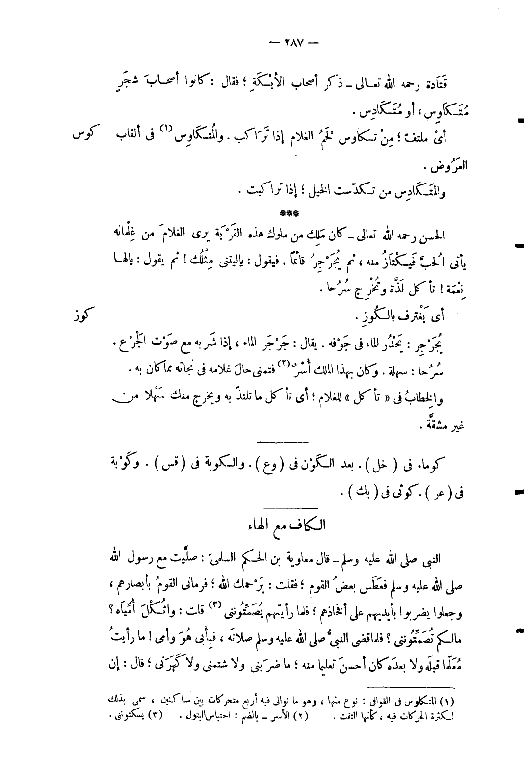 كهر النَّبِي صلى الله عَلَيْهِ وَسلم قَالَ مُعَاوِيَة بن الحكم السّلمِيّ: صليت مَعَ رَسُول الله صلى الله عَلَيْهِ وَسلم فعطس بعض الْقَوْم فَقلت: يَرْحَمك الله فَرَمَانِي الْقَوْم بِأَبْصَارِهِمْ وَجعلُوا يضْربُوا بِأَيْدِيهِم على أَفْخَاذهم فَلَمَّا رَأَيْتهمْ يصمتونني قلت: واثكل أُمياه مالكم تُصمِّتونني فَلَمَّا قضى النَّبِي صلى الله عَلَيْهِ وَسلم صلَاته فبأبي هُوَ وَأمي مَا رَأَيْت معلما قبله وَلَا بعده كَانَ أحسن تَعْلِيما مِنْهُ مَا ضَرَبَنِي وَلَا شَتَمَنِي وَلَا كَهَرَنِي قَالَ: إِن