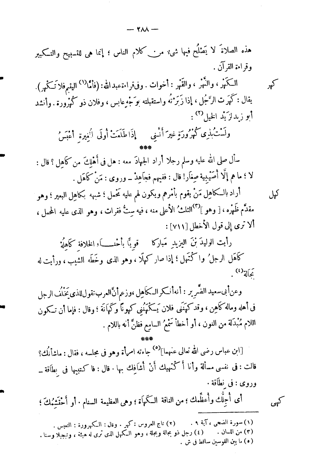 كهل سَأَلَ صلى الله عَلَيْهِ وَسلم رجلا أَرَادَ الْجِهَاد مَعَه: هَل فِي اهلك من كَاهِل قَالَ: لَا مَا هم إِلَّا أصيبية صغَار قَالَ: ففيهم فَجَاهد وروى: من كَاهَل. أَرَادَ بالكاهل من يقوم بأمرهم وَيكون لَهُم عَلَيْهِ محمل شبهه بكاهل الْبَعِير وَهُوَ مقدَّم ظَهره وَهُوَ الثُّلُث الْأَعْلَى مِنْهُ فِيهِ سِتّ فقرات وَهُوَ الَّذِي عَلَيْهِ الْمحمل أَلا ترى إِلَى قَول الأخطل: ... رَأَيْت الوليدَ بْنَ اليزيدِ مَباركا ... قوِيًّا بأحْنَاءِ الخلافةِ كَاهِلُهْ ... كَاهِل الرجل واكتهل إِذا صَار كهلاً وَهُوَ الَّذِي وخطه الشيب وَرَأَيْت لَهُ بجالة. وَعَن أبي سعيد الضَّرِير: أَنه أنكر الْكَاهِل وَزعم أَن الْعَرَب تَقول الَّذِي يخلف الرجل فِي أَهله وَمَاله كَاهِن وَقد كهنني فلَان يكهنني كهوناً وكهانة وَقَالَ: فإمَّا أَن تكون اللَّام مبدلة من النُّون أَو أَخطَأ سمع السَّامع فَظن أَنه بِاللَّامِ.