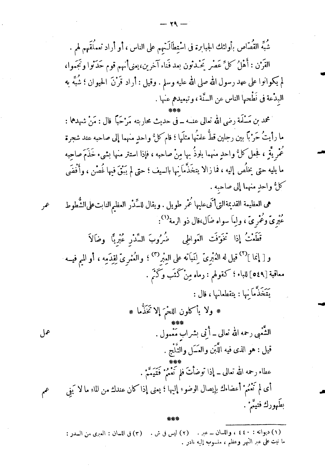 عمر هِيَ العظمة الْقَدِيمَة الَّتِي أَتَى عَلَيْهَا عمر طَوِيل. وَيُقَال للسدر الْعَظِيم النَّابِت على الشطوط عبري وعمري وَلما سواهُ ضال قَالَ ذُو الرمة: ... قَطَعْتُ إِذا تخَوّفَت العواطى ... ضروب السدر عبريا وضال ... اَوْ [إِنَّمَا] قيل لَهُ العبري لنباته على العبر والعمري لقدمه أَو الْمِيم فِيهِ معاقبة للباء كَقَوْلِهِم: رَمَاه من كثب وكثم. يتَّخذ مانها: يتقطعانها قَالَ ... وَلَا يَأْكُلُون اللحْمَ إِلَّا تَخَذُّما ...