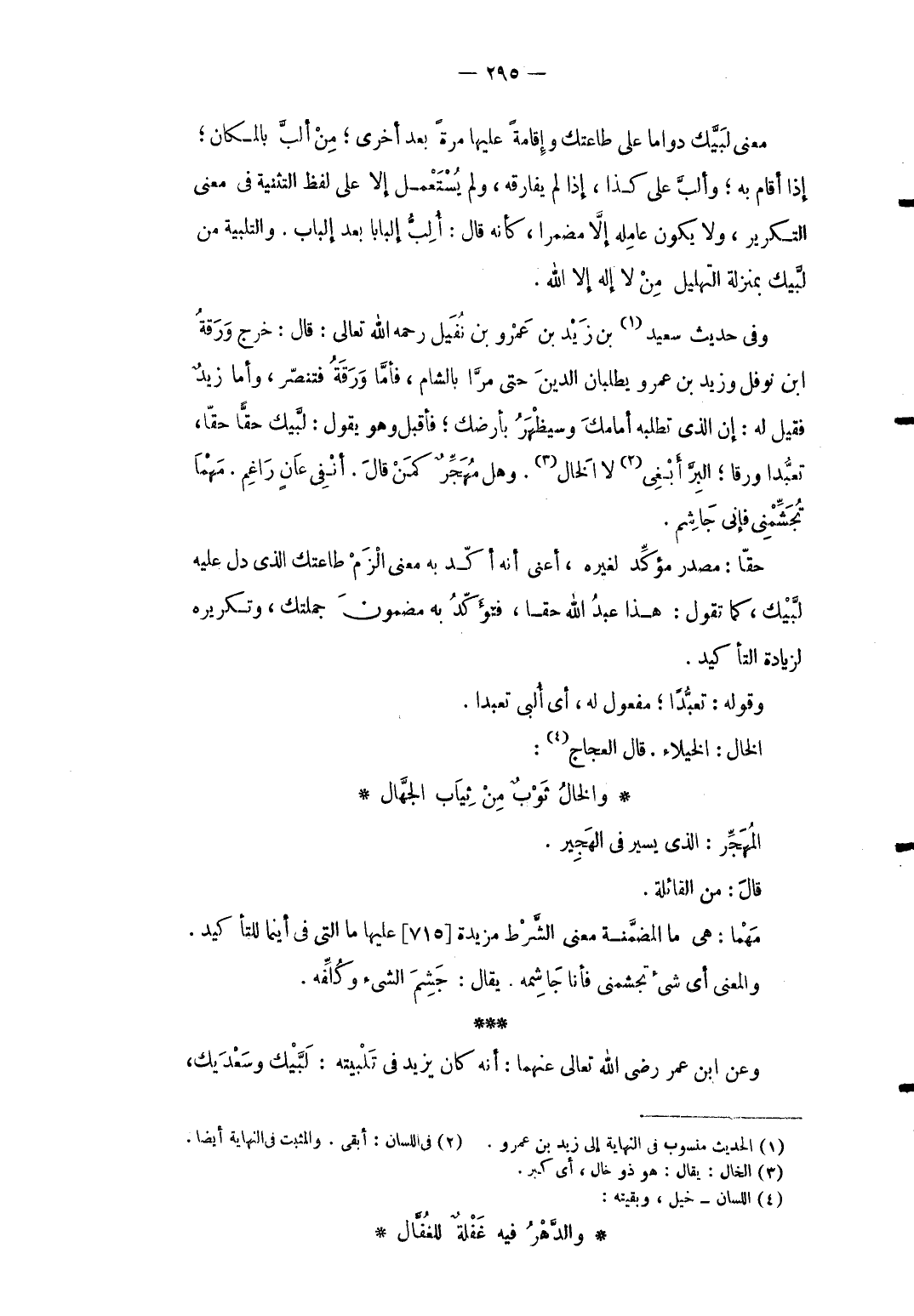 معنى لبيْك دواما على طَاعَتك وَإِقَامَة عَلَيْهَا مرّة بعد أُخْرَى من ألبَّ بِالْمَكَانِ إِذا أَقَامَ بِهِ وألبَّ على كَذَا إِذا لم يُفَارِقهُ وَلم يُستعمل إِلَّا على لفظ التَّثْنِيَة فِي معنى التكرير وَلَا يكون عَامله إِلَّا مضمرا كَأَنَّهُ قَالَ: أُلِبُّ ألبابا بعد إلباب. والتلبية من لبيْك بِمَنْزِلَة التهليل من لَا إِلَه إِلَّا الله. وَفِي حَدِيث سعيد بن زيد بن عَمْرو بن نفَيْل رَحمَه الله تَعَالَى: قَالَ: خرج ورقة ابْن نَوْفَل وَزيد بن عَمْرو يطلبان الدّين حَتَّى مرا بِالشَّام فأمَّا ورقة فتنصّر وَأما زيد فَقيل لَهُ: إِن الَّذِي تطلبه أمامك وسيظهر بأرضك فَأقبل وَهُوَ يَقُول: لبيْك حقاًّ حَقًا تعبُّدا وَرقا الْبر أبغى لَا الْخَال. وَهل مهجر كمن قَالَ. أنفي عان راغم. مهما تجشمني فَإِنِّي جاشم. حقاّ: مصدر مُؤَكد لغيره أَعنِي أَنه أكد بِهِ معنى الزم طَاعَتك الَّذِي دلّ عَلَيْهِ لبيْك كَمَا تَقول: هَذَا عبد الله حَقًا فتؤكد بِهِ مَضْمُون جملتك وتكريره لزِيَادَة التَّأْكِيد. وَقَوله: تعبُّداً مفعول لَهُ أَي أُلبي تعبدا. الْخَال: الْخُيَلَاء. قَالَ العجاج: ... والخالُ ثَوْبٌ مِنْ ثِيَاب الجَّهال ... المهجِّر: الَّذِي يسير فِي الهجير. قَالَ: من القائلة. مهما: هِيَ مَا المضمنة معنى الشَّرْط مزيدة عَلَيْهَا مَا الَّتِي فِي أَيْنَمَا للتَّأْكِيد. وَالْمعْنَى أَي شَيْء تجشمني فَأَنا جاشمه. يُقَال: جشم الشَّيْء وكُلِّفه. وَعَن ابْن عمر رَضِي الله تَعَالَى عَنْهُمَا: أَنه كَانَ يزِيد فِي تلبيته: لبيْك وَسَعْديك