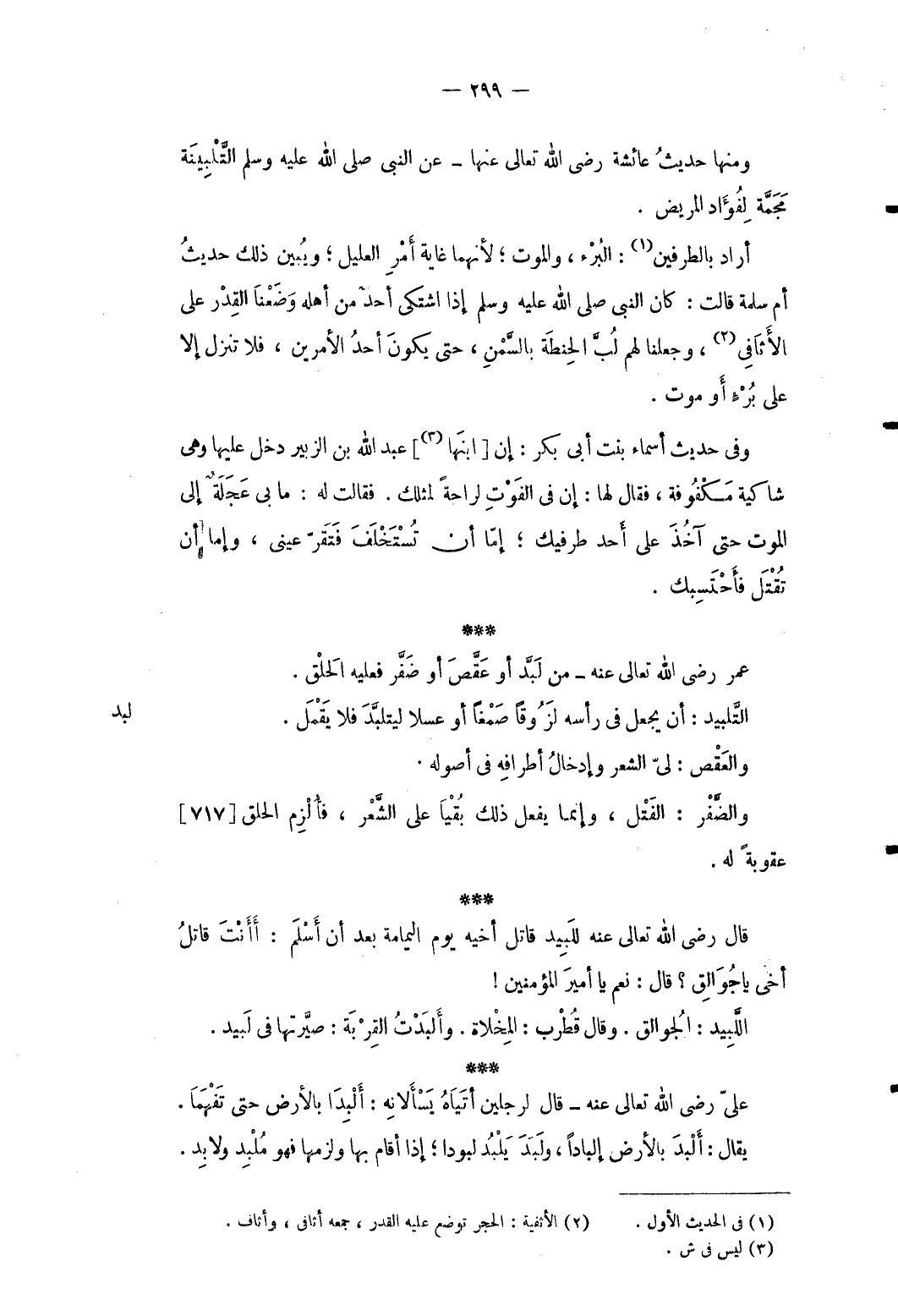 وَمِنْهَا حَدِيث عَائِشَة رَضِي الله تَعَالَى عَنْهَا عَن النَّبِي صلى الله عَلَيْهِ وَسلم التلبينة مجمَّة لفؤاد الْمَرِيض. أَرَادَ بالطرفين: الْبُرْء وَالْمَوْت لِأَنَّهُمَا غَايَة أَمر العليل وَيبين ذَلِك حَدِيث أم سَلمَة قَالَت: كَانَ النَّبِي صلى الله عَلَيْهِ وَسلم إِذا اشْتَكَى أحد من أَهله وَضعنَا الْقدر على الأثافي وَجَعَلنَا لَهُم لُبَّ الْحِنْطَة بالسمن حَتَّى يكون أحد الْأَمريْنِ فَلَا تنزل إِلَّا على برءٍ أَو موت. وَفِي حَدِيث أَسمَاء بنت أبي بكر: إِن ابْنهَا عبد الله بن الزبير دخل عَلَيْهَا وَهِي شاكية مَكْفُوفَة فَقَالَ لَهَا: إِن فِي الْفَوْت لراحة لمثلك. فَقَالَت لَهُ: مَا بِي عجلة إِلَى الْمَوْت حَتَّى آخذ على أحد طرفيك إِمَّا أَن تسْتَخْلف فتقرّ عَيْني وَإِمَّا أَن تقتل فأحتسبك.