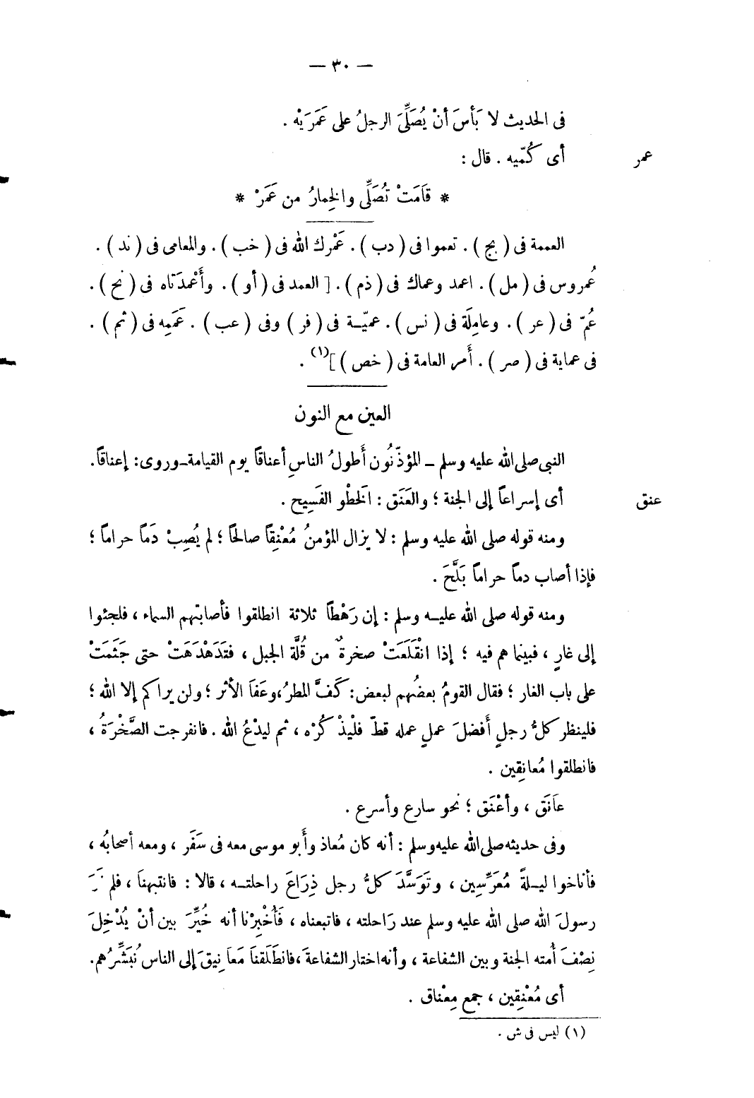 عنق أَي إسراعاً إِلَى الْجنَّة والعنق: الخطو الفسيح. وَمِنْه قَوْله صلى الله عَلَيْهِ وَسلم: لَا يزَال الْمُؤمن معنقاً صَالحا لم يصب دَمًا حَرَامًا فَإِذا أصَاب دَمًا حَرَامًا بلَّحَ. وَمِنْه قَوْله صلى الله عَلَيْهِ وَسلم: إِن رهطاً ثَلَاثَة انْطَلقُوا فَأَصَابَتْهُمْ السَّمَاء فَلَجَئُوا إِلَى غارٍ فَبَيْنَمَا هم فِيهِ إِذا انقلعت صَخْرَة من قُلَّة الْجَبَل فتدهدهت حَتَّى جثمت على بَاب الْغَار فَقَالَ الْقَوْم بَعضهم لبَعض: كفَّ الْمَطَر وَعَفا الْأَثر وَلنْ يراكم إِلَّا الله فَلْينْظر كل رجل أفضل عمل عمله قطّ فليذكره ثمَّ ليدعُ الله. فانفرجت الصَّخْرَة فَانْطَلقُوا معانقين. عانق وأعنق نَحْو سارع وأسرع. وَفِي حَدِيثه صلى الله عَلَيْهِ وَسلم: أَنه كَانَ معَاذ وَأَبُو مُوسَى مَعَه فِي سفر وَمَعَهُ أَصْحَابه فأناخوا لَيْلَة معرسين وتوسد كل رجل ذِرَاع رَاحِلَته قَالَا: فانتبهنا فَلم نر رَسُول الله صلى الله عَلَيْهِ وَسلم عِنْد رَاحِلَته فاتبعناه فأُخبرنا أَنه خيِّر بَين أَن يُدخل نصف أمته الْجنَّة وَبَين الشَّفَاعَة وَأَنه اخْتَار الشَّفَاعَة فَانْطَلَقْنَا مَعًا نيق إِلَى النَّاس نبشرهم. أَي معنقين جمع معناق.