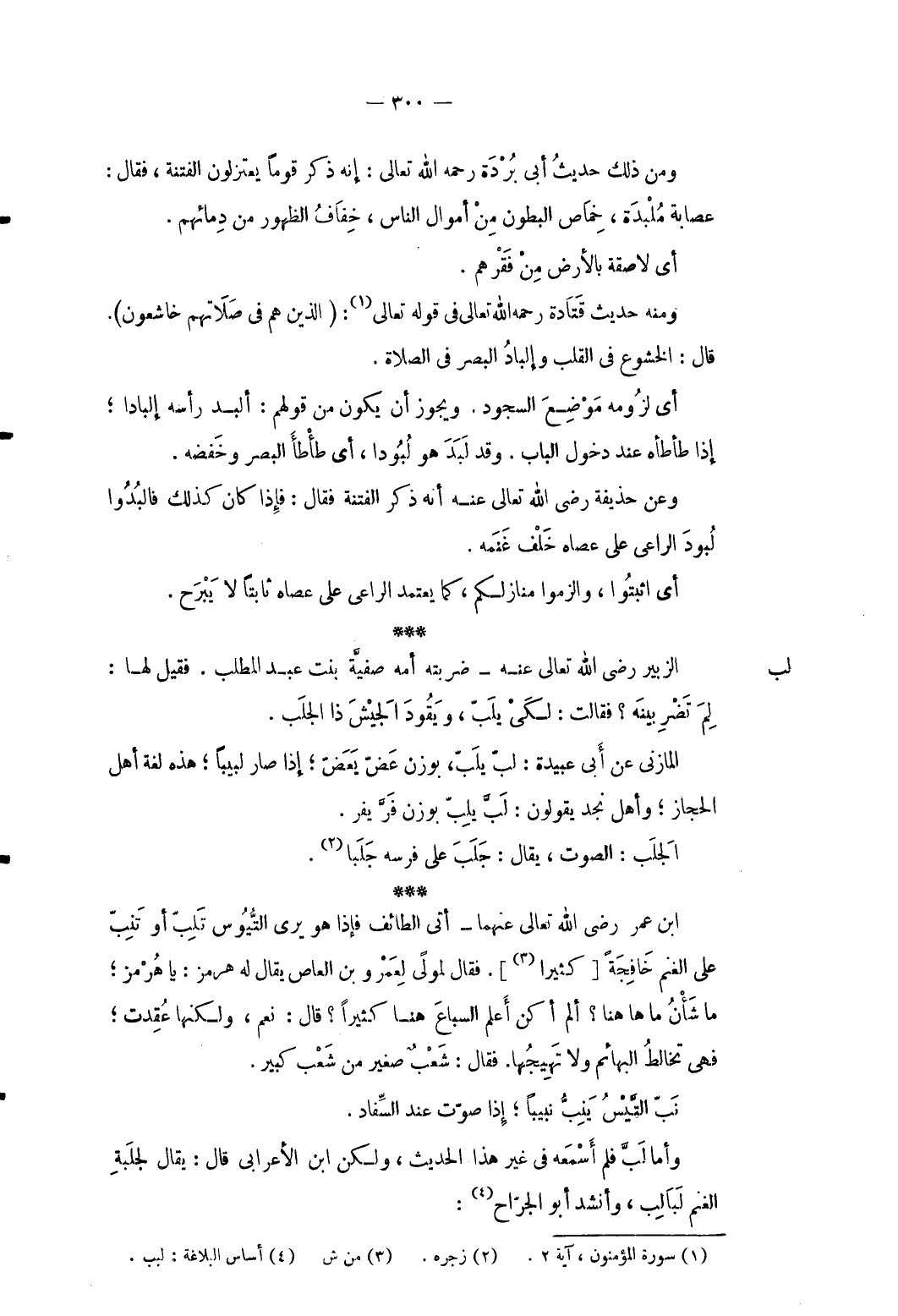 وَمن ذَلِك حَدِيث أبي بردة رَحمَه الله تَعَالَى: إِنَّه ذكر قوما يعتزلون الْفِتْنَة فَقَالَ: عِصَابَة ملبدة خماص الْبُطُون من أَمْوَال النَّاس خفاف الظُّهُور من دِمَائِهِمْ. أَي لاصقة بِالْأَرْضِ من فَقرهمْ. وَمِنْه حَدِيث قَتَادَة رَحمَه الله تَعَالَى فِي قَوْله تَعَالَى: {الَّذين هم فِي صَلاَتهم خاشعون} . قَالَ الْخُشُوع فِي الْقلب وإلباد الْبَصَر فِي الصَّلَاة. أَي لزمَه مَوضِع السُّجُود. وَيجوز أَن يكون من قَوْلهم: ألبد رَأسه إلبادا إِذا طأطأه عِنْد دُخُول الْبَاب. وَقد لبدا هُوَ لبودا أَي طأطأ الْبَصَر وخفضه. وَعَن حُذَيْفَة رَضِي الله تَعَالَى عَنهُ أَنه ذكر الْفِتْنَة فَقَالَ: فَإِذا كَانَ كَذَلِك فالبدوا لبود الرَّاعِي على عَصَاهُ خلف غنمه. أَي اثبتوا وألزموا مَنَازِلكُمْ كَمَا يعْتَمد الرَّاعِي على عَصَاهُ ثَابتا لَا يبرح.