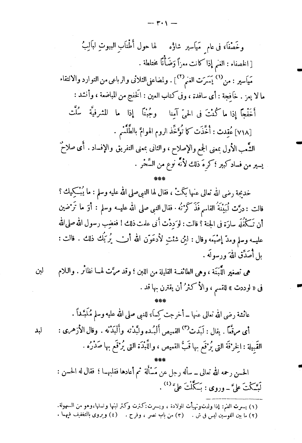 .. وخَصْفَاءَ فِي عامٍ مَيَاسير شاؤُه ... لَهَا حول أَطْنَابٍ البيوتِ لبَالِبُ ... الخصفاء: الْغنم إِذا كَانَت معزاً وضأناً مختلطة. مياسير: من يسرت الْغنم. ولمضاعفي الثلاثي والرباعي من التوارد والالتقاء مَا لَا يعز. خافجة: أَي سافدة وَفِي كتاب الْعين: الخفج من المباضعة وَأنْشد: ... أَخَفْجاً إِذا مَا كُنْتَ فِي الحيّ آمِنا ... وجُبْناً إِذا مَا المشرفَّية سُلَّت ... عقدت: أُخذت كَمَا تُؤْخَذ الرّوم الهوامَّ بالطلَّسم. الشّعب الأول بِمَعْنى الْجمع والإصلاح وَالثَّانِي بِمَعْنى التَّفْرِيق والإفساد. أَي صَلَاح يسير من فَسَاد كَبِير كره ذَلِك لِأَنَّهُ نوع من السحر.