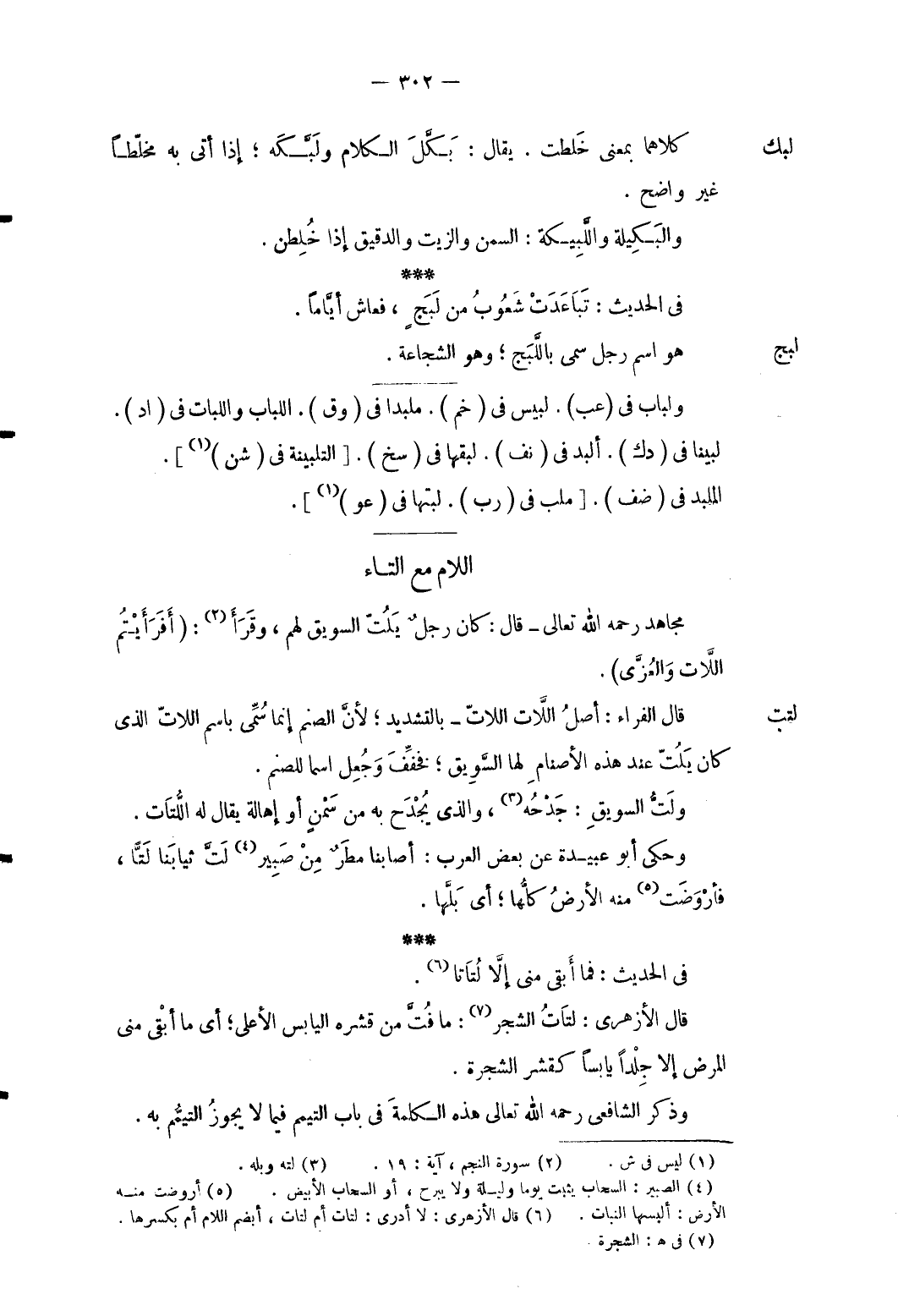 لتت مُجَاهِد رَحمَه الله تَعَالَى قَالَ: كَانَ رجل يلت السويق لَهُم وَقَرَأَ: {أَفَرَأَيْتُم اللاَت وَالعُزَّى} قَالَ الْفراء: أصل اللاَّت اللاتّ بِالتَّشْدِيدِ لِأَن الصَّنَم إِنَّمَا سُميِّ باسم اللاتّ الَّذِي كَانَ يلت عِنْد هَذِه الْأَصْنَام لَهَا السويق فَخفف وَجعل اسْما للصنم. ولتُّ السويق: جدحه وَالَّذِي يجدح بِهِ من سمن أَو إهالة يُقَال لَهُ اللتات. وَحكى أَبُو عُبَيْدَة عَن بعض الْعَرَب: أَصَابَنَا مطر من صبير لتَّ ثيابنا لتًّا فأروضت مِنْهُ الأَرْض كلهَا أَي بلها. فِي الحَدِيث: فَمَا أبقى مني إِلَّا لتاتا. قَالَ الْأَزْهَرِي: لتات الشّجر: مَا فت من قشره الْيَابِس الْأَعْلَى أَي مَا أبقى مني الْمَرَض إِلَّا جلدا يَابسا كقشر الشَّجَرَة. وَذكر الشَّافِعِي رَحمَه الله تَعَالَى هَذِه الْكَلِمَة فِي بَاب التَّيَمُّم فِيمَا لَا يجوز التَّيَمُّم بِهِ.