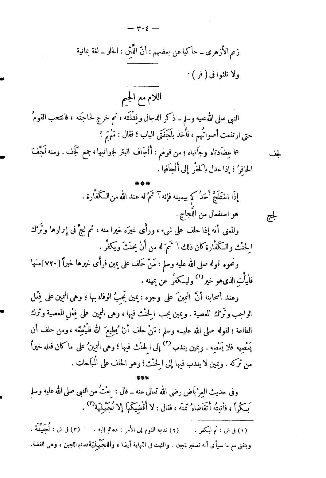 لجج إِذا استلجَّ أحدكُم بِيَمِينِهِ فَإِنَّهُ آثم لَهُ عِنْد الله من الْكَفَّارَة. هُوَ استفعال من اللجاج. وَالْمعْنَى أَنه إِذا حلف على شَيْء وَرَأى غَيره خيرا مِنْهُ ثمَّ لجَّ فِي إبرارها وَترك الْحِنْث وَالْكَفَّارَة كَانَ ذَلِك آثم لَهُ من أَن يَحْنَث وَيكفر. وَنَحْوه قَوْله صلى الله عَلَيْهِ وَسلم: من حلف على يَمِين فَرَأى غَيرهَا خيرا مِنْهَا فليأت الَّذِي هُوَ خير وليكفِّر عَن يَمِينه. وَعند أَصْحَابنَا أَن الْيَمين على وُجُوه: يَمِين يجب الْوَفَاء بهَا وَهِي الْيَمين على فعل الْوَاجِب وَترك الْمعْصِيَة. وَيَمِين يجب الْحِنْث فِيهَا وَهِي الْيَمين على فعل الْمعْصِيَة وَترك الطَّاعَة لقَوْله صلى الله عَلَيْهِ وَسلم: من حلف أَن يُطِيع الله فليطعه وَمن حلف أَن يعصيه فَلَا يَعْصِهِ. وَيَمِين ينْدب إِلَى الْحِنْث فِيهَا وَهِي الْيَمين على مَا كَانَ فعله خيرا من تَركه. وَيَمِين لَا ينْدب فِيهَا إِلَى الْحِنْث وَهُوَ الْحلف على الْمُبَاحَات. وَفِي حَدِيث الْعِرْبَاض رَضِي الله تَعَالَى عَنهُ قَالَ: بِعْت من النَّبِي صلى الله عَلَيْهِ وَسلم بكرا فَأَتَيْته أَتَقَاضَاهُ ثمنه فَقَالَ: لَا أقضيكها إِلَّا لُجينية.
