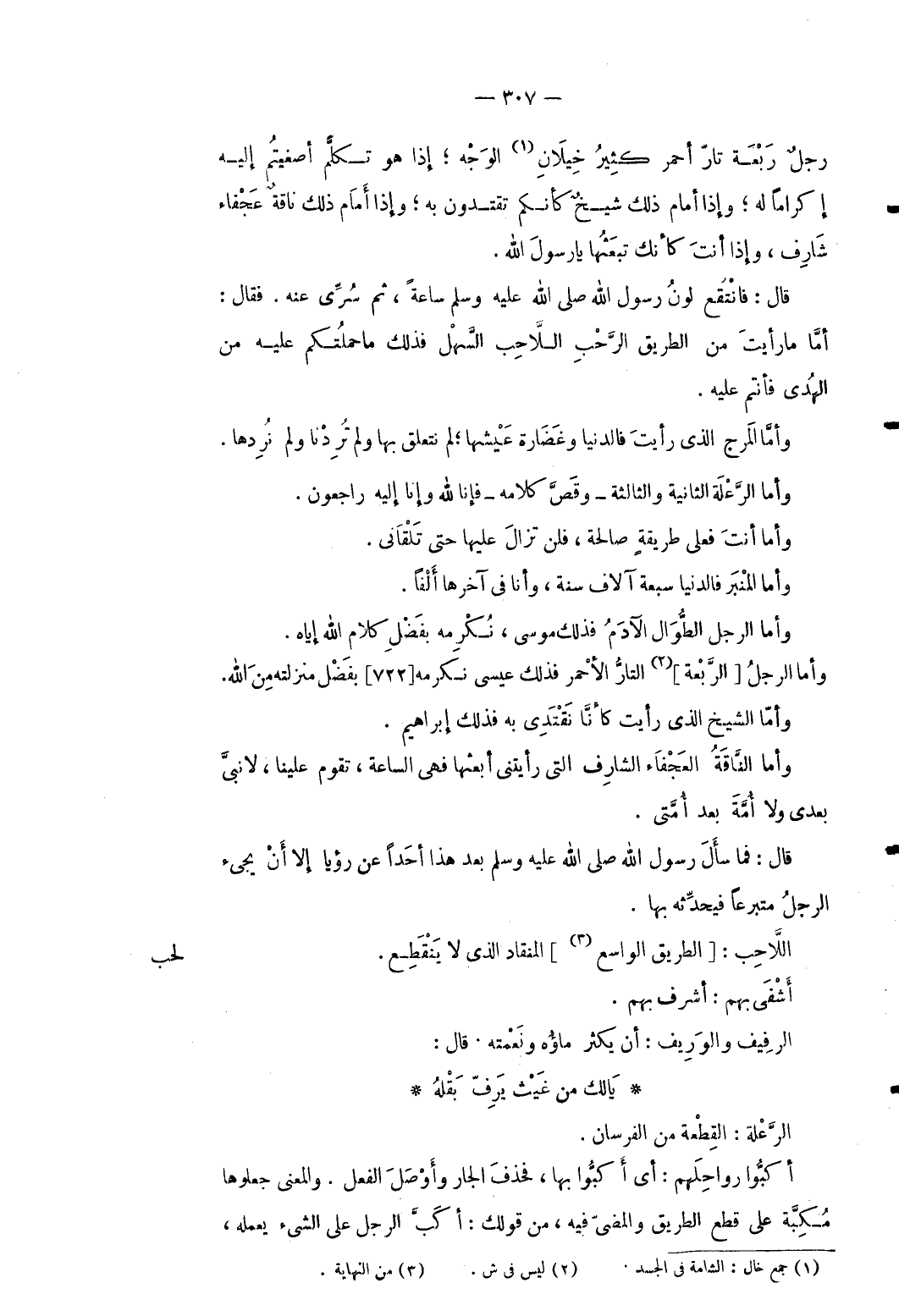رجل ربعَة تارّ أَحْمَر كثير خيلان الْوَجْه إِذا هُوَ تكلم أصغيتم إِلَيْهِ إِكْرَاما لَهُ وَإِذا أَمَام ذَلِك شيخ كأنكم تقتدون بِهِ وَإِذا أَمَام ذَلِك نَاقَة عجفاء شَارف وَإِذا أَنْت كَأَنَّك تبعثها يَا رَسُول الله. قَالَ: فَانْتَفع لون رَسُول الله صلى الله عَلَيْهِ وَسلم سَاعَة ثمَّ سري عَنهُ. فَقَالَ: أما مَا رَأَيْت من الطَّرِيق الرحب اللاحب السهل فَذَلِك مَا حملتكم عَلَيْهِ من الهُدى فَأنْتم عَلَيْهِ. وأمَّا المرج الَّذِي رَأَيْت فالدنيا وغضارة عيشها لم نتعلق بهَا وَلم تُردنا وَلم نردها. وَأما الرَّعْلَة الثَّانِيَة وَالثَّالِثَة وقصَّ كَلَامه فَإنَّا لله وَإِنَّا إِلَيْهِ رَاجِعُون وَأما أَنْت فعلى طَريقَة صَالِحَة فَلَنْ تزَال عَلَيْهَا حَتَّى تَلقانِي. وَأما الْمِنْبَر فالدنيا سَبْعَة آلَاف سنة وَأَنا فِي آخرهَا ألفا. وَأما الرجل الطُّوال الآدم فَذَلِك مُوسَى نُكرمه بِفضل كَلَام الله إِيَّاه. وَأما الرجل الربعة التارُّ الْأَحْمَر فَذَلِك عِيسَى نكرمه بِفضل مَنْزِلَته من الله. وَأما الشَّيْخ الَّذِي رَأَيْت كأنَّا نقتدي بِهِ فَذَلِك إِبْرَاهِيم. وَأما النَّاقة الْعَجْفَاء الشارف الَّتِي رَأَيْتنِي أبعثها فَهِيَ السَّاعَة تقوم علينا لَا نبيَّ بعدِي وَلَا أمَّة بعد أمتِي. قَالَ: فَمَا سَأَلَ رَسُول الله صلى الله عَلَيْهِ وَسلم بعد هَذَا أحدا عَن رُؤْيا إِلَّا أَن يَجِيء الرجل مُتَبَرعا فيحدِّثه بهَا. اللاحب: الطَّرِيق الْوَاسِع المنقاد الَّذِي يَنْقَطِع. أشفى بهم: أشرف بهم. الرفيف والوريف: أَن يكثر ماؤُه وَنعمته. قَالَ: ... يَا لَك من غَيْث يَرِفّ بَقْلُه ... الرَّعلة: الْقطعَة من الفرسان. أكبُّوا رواحلهم: أَي أكبُّوا بهَا فَحذف الْجَار وأوصل الْفِعْل. وَالْمعْنَى جعلوها مُكبَّة على قطع الطَّرِيق والمضي فِيهِ من قَوْلك: أكبَّ الرجل على الشَّيْء يعمله