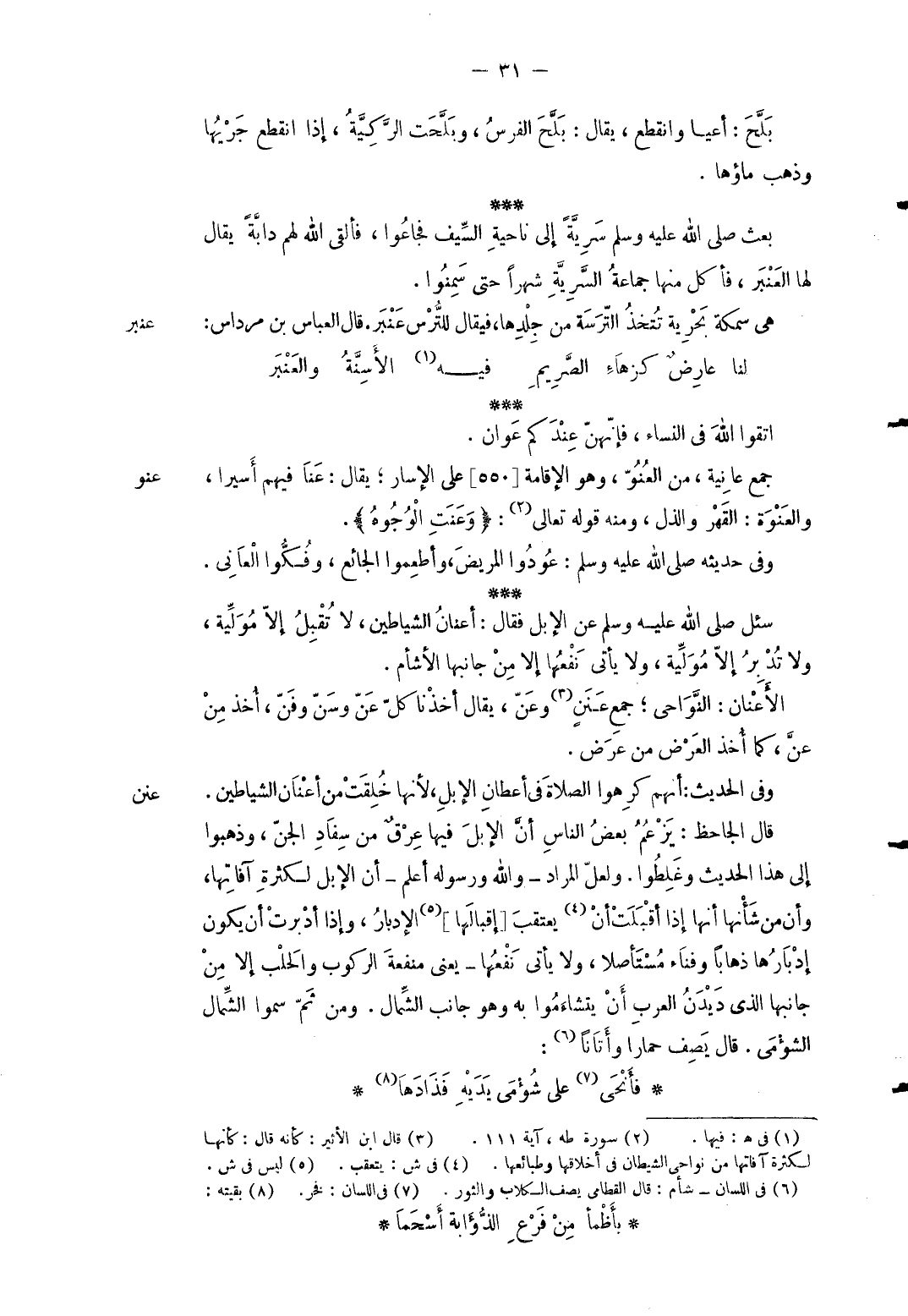 عنن سُئِلَ صلى الله عَلَيْهِ وَسلم عَن الْإِبِل فَقَالَ أعنان الشَّيَاطِين لَا تقبل إِلَّا مولِّية وَلَا تدبر إِلَّا مولِّية وَلَا يَأْتِي نَفعهَا إِلَّا من جَانبهَا الأشأم الأعنان: النواحي جمع عنن وعنّ يُقَال أَخذنَا كل عنّ وسنّ وفنّ أُخذ من عنَّ كَمَا أُخذ الْعرض من عرض. وَفِي الحَدِيث أَنهم كَرهُوا الصَّلَاة فِي أعطان الْإِبِل لِأَنَّهَا خُلقت من أعنان الشَّيَاطِين قَالَ الجاحظ: يزْعم بعض النَّاس أَن الْإِبِل فِيهَا عرق من سفاد الْجِنّ وذهبوا إِلَى هَذَا الحَدِيث وغلطوا وَلَعَلَّ المُرَاد وَالله وَرَسُوله أعلم أَن الْإِبِل لكثيرة آفاتها وَأَن من شَأْنهَا أَنَّهَا إِذا أَقبلت أَن يعتقب إقبالها الإدبار وَإِذا أَدْبَرت أَن يكون إدبارها ذَهَابًا وفناء مستأصلا وَلَا يَأْتِي نَفعهَا يَعْنِي مَنْفَعَة الرّكُوب والحلب إِلَّا من جَانبهَا الَّذِي ديدن الْعَرَب أَن يتشاءموا بِهِ وَهُوَ جَانب الشمَال وَمن ثمَّ سموا الشمَال الشؤمى قَالَ يصف حمارا وأتاناً: ... فأَنْحَى على شُؤْمَي يَدَيْهِ فَذَادَهَا ...