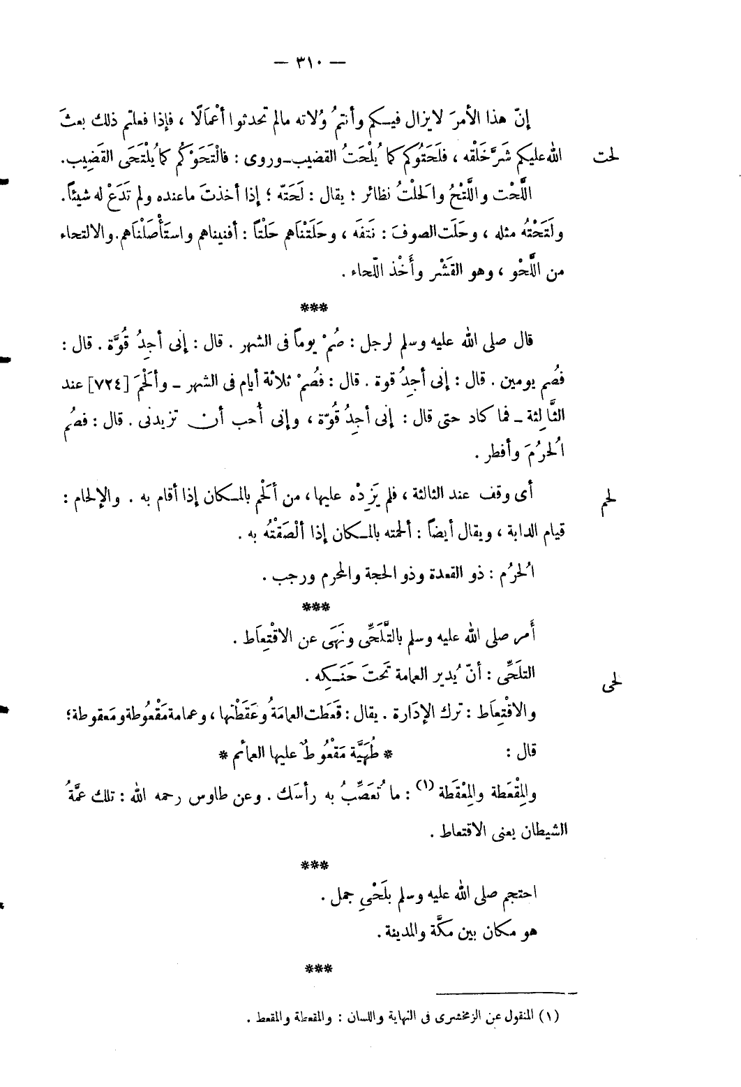 لحم قَالَ صلى الله عَلَيْهِ وَسلم: صُمْ يَوْمًا فِي الشَّهْر. قَالَ: إِنِّي أجد قُوَّة. قَالَ: فَصم يَوْمَيْنِ. قَالَ: إِنِّي أجد قُوَّة. قَالَ: فَصم ثَلَاثَة أَيَّام فِي الشَّهْر وألحم عِنْد الثَّالِثَة فَمَا كَاد حَتَّى قَالَ: إِنِّي أجد قُوَّة وَإِنِّي أحب أَن تزيدني. قَالَ: فَصم الحُرم وَأفْطر. أَي وقف عِنْد الثَّالِثَة فَلم يزده عَلَيْهَا من ألحم بِالْمَكَانِ إِذا أَقَامَ بِهِ. والإلحام: قيام الدَّابَّة وَيُقَال أَيْضا: ألحمته بِالْمَكَانِ إِذا أَلْصَقته بِهِ. الحُرُم: ذُو الْقعدَة وَذُو الْحجَّة وَالْمحرم وَرَجَب.