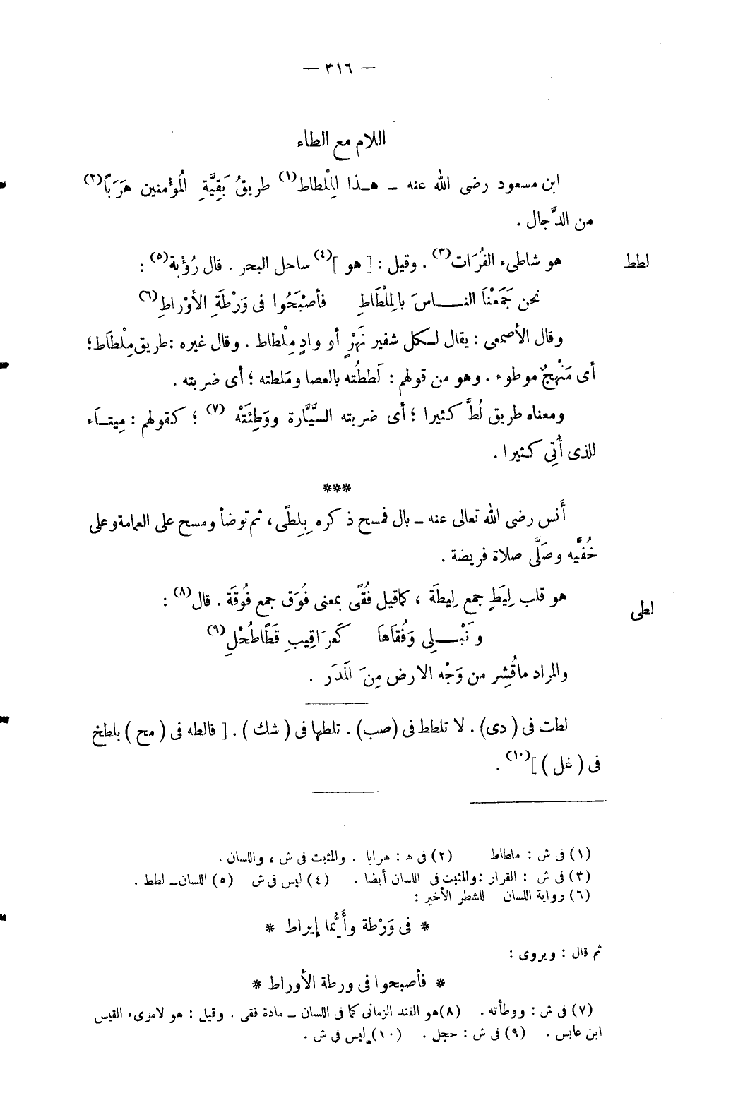 لطط ابْن مَسْعُود رَضِي الله عَنهُ هَذَا الملطاط طَرِيق بَقِيَّة الْمُؤمنِينَ هرباً من الدَّجَّال. هُوَ شاطئ الْفُرَات. وَقيل: [هُوَ] سَاحل الْبَحْر. قَالَ رؤبة: ... نَحن جَمَعْنَا الناسَ بالمِلْطَاطِ ... فأصْبَحُوا فِي وَرْطَةِ الأوْراطِ ... وَقَالَ الْأَصْمَعِي: يُقَال لكل شَفير نهر أَو وادٍ ملطاط. وَقَالَ غَيره: طَرِيق ملطاط أَي مَنْهَج موطوء. وَهُوَ من قَوْلهم: لططته بالعصا وملطته أَي ضَربته. وَمَعْنَاهُ طَرِيق لُطَّ كثيرا أَي ضَربته السيارة ووطئته كَقَوْلِهِم: ميتاء للَّذي أُتِي كثيرا.