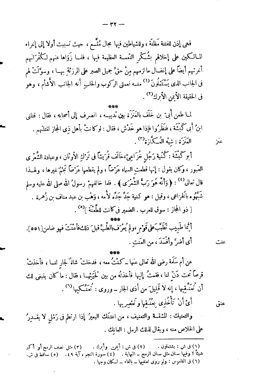 عنز لما طعن أُبي بن خلف بالعنزة بَين ثدييه انْصَرف إِلَى أَصْحَابه فَقَالَ قتلني ابْن أبي كَبْشَة فنظروا فَإِذا هُوَ خدش فَقَالَ لَو كَانَت بِأَهْل ذِي الْمجَاز لقتلتهم العنزة: شبه العكازة أَبُو كَبْشَة كنية رجل خزاعي خَالف قُريْشًا فِي ترك الْأَوْثَان وَعبادَة الشعرى العبور وَكَانَ يَقُول إِنَّهَا قطعت السَّمَاء عرضا وَلم يقطعهَا عرضا نجم غَيرهَا وَلِهَذَا قَالَ تَعَالَى {وَأنَّه هُوَ رَبُّ الشِّعْرَى} فَلَمَّا خالفهم رَسُول الله صلى الله عَلَيْهِ وَسلم شبهوه بالخزاعي وَقيل هُوَ كنية جد جده لأمه وهب بن عبد منَاف بن زهرَة. ذُو الْمجَاز: سوق للْعَرَب الضَّمِير فِي كَانَت للطعنة