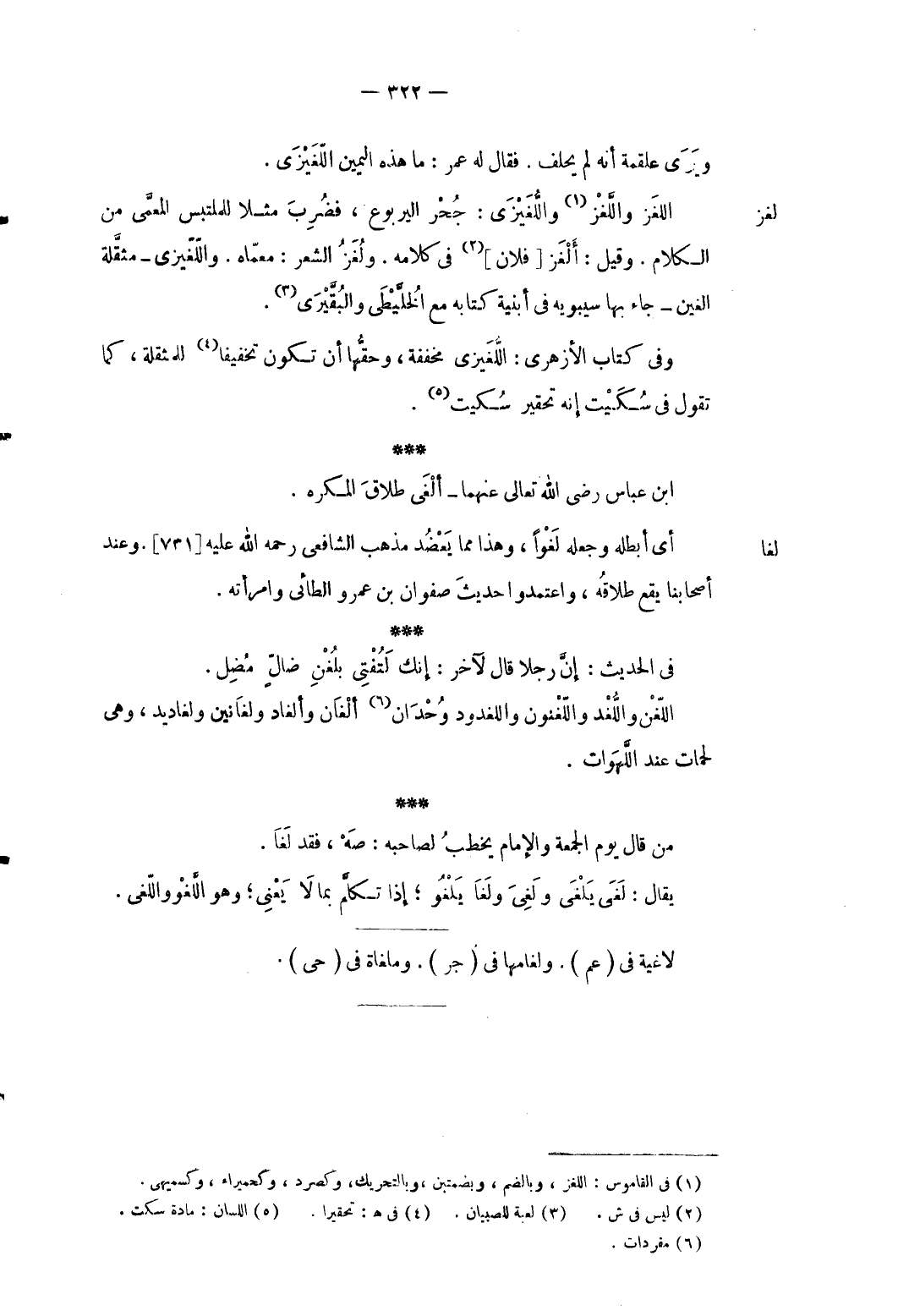 لَغَا ابْن عَبَّاس رَضِي الله تَعَالَى عَنْهُمَا _ ألغى طَلَاق الْمُكْره. أَي أبْطلهُ وَجعله لَغوا وَهَذَا مِمَّا يعضد مَذْهَب الشَّافِعِي رَحمَه الله عَلَيْهِ. وَعند أَصْحَابنَا يَقع طَلَاقه واعتمدوا حَدِيث صَفْوَان بن عَمْرو الطَّائِي وَامْرَأَته. فِي الحَدِيث: إِن رجلا قَالَ لآخر: إِنَّك لتفتي بلغن ضالٍّ مضل اللّغن واللّغد واللغنون واللغدود وحدان ألغان وألغاد ولغانين ولغاديد وَهِي لحمات عِنْد اللهوات. من قَالَ يَوْم الْجُمُعَة وَالْإِمَام يخْطب لصحابه: صه فقد لَغَا. يُقَال: لغى يلغى ولغي ولغا يَلْغُو إِذا تكلم بِمَا لَا يَعْنِي وَهُوَ اللَّغْو واللغي.
