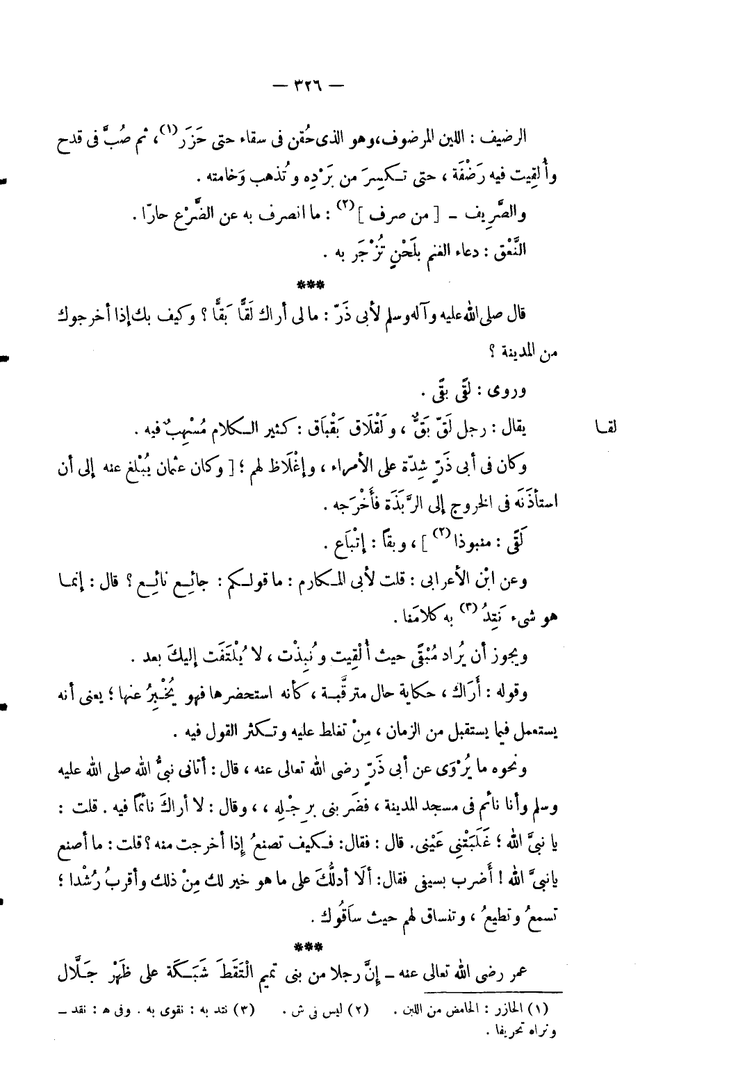 الرضيف: اللَّبن المرضوف وَهُوَ الَّذِي حقن فِي سقاء حَتَّى حزر ثمَّ صب فِي قدح وألقيت فِيهِ رضفة حَتَّى تكسر من برده وَتذهب وخامته. والصريف [من صرف] مَا انْصَرف بِهِ عَن الضَّرع حارا. النعق: دُعَاء الْغنم بلحن تزجر بِهِ.