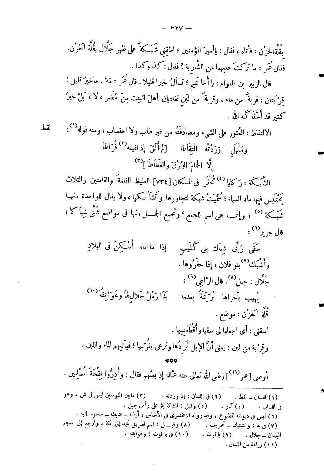 بقلة الْحزن فَأَتَاهُ فَقَالَ: يَا أَمِير الْمُؤمنِينَ اسْقِنِي شبكةً على ظهر جلاّل بقلَّة الْحزن. فَقَالَ عمر: مَا تركت عَلَيْهِمَا من الشَّاربة فَقَالَ: كَذَا وَكَذَا. قَالَ الزبير بن الْعَوام: يَا أَخا تَمِيم تسْأَل خيرا قَلِيلا. قَالَ عمر: مَه مَا خيرٌ قَلِيل قربتان قربَة من مَاء وقربةٌ من لبن تغاديان أهل الْبَيْت من مُضر لَا بل خير كثير قد أسقاكه الله. الِالْتِقَاط: العثور على الشَّيْء ومصادفته من غير طلب وَلَا احتساب وَمِنْه قَوْله: ... ومنهل وَرَدْتُه الْتِقَاطا ... [لم أَلْقَ إِذْ لَقيته فُرَاطَا