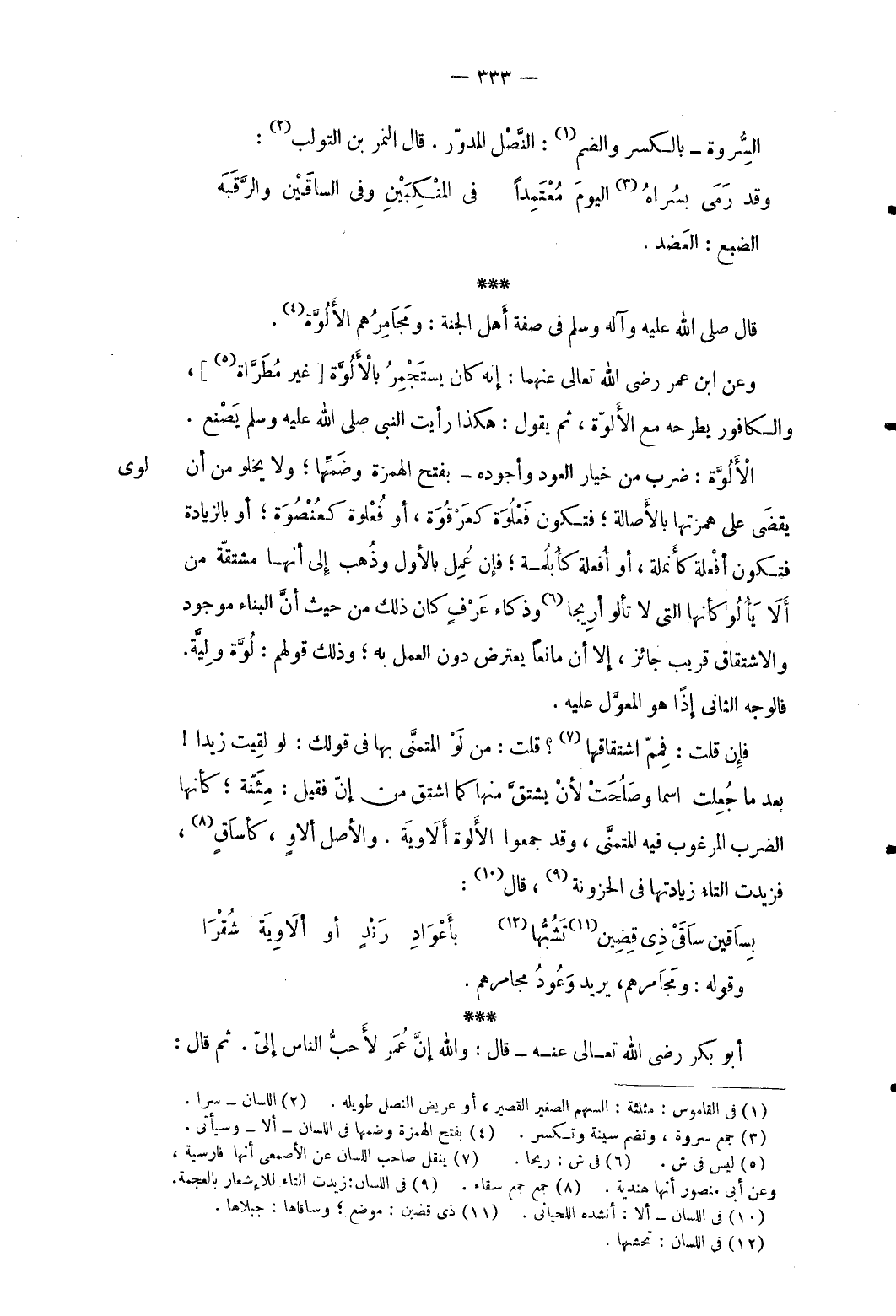 لوى قَالَ صلى الله عَلَيْهِ وَسلم فِي صفة أهل الْجنَّة: ومجامرهم الألوة. وَعَن ابْن عمر رَضِي الله تَعَالَى عَنْهُمَا: إِنَّه كَانَ يستجمر بالألوة غير مطرَّاة. والكافور يطرحه مَعَ الألوة ثمَّ يَقُول: هَكَذَا رَأَيْت النَّبِي صلى الله عَلَيْهِ وَسلم يصنع الألوة: ضرب من خِيَار الْعود وأجوده بِفَتْح الْهمزَة وضمِّها وَلَا يَخْلُو من أَن يقْضِي على همزتها بِالْأَصَالَةِ فَتكون فعلوة كعرقوة أَو فعلوة كعنصوة أَو بِالزِّيَادَةِ فَتكون أفعلة كأنملة أَو أفعلة كأبلمة فَإِن عمل بِالْأولِ وَذهب إِلَى أَنَّهَا مُشْتَقَّة من أَلا يألو كَأَنَّهَا لَا تألوا أريجا وذكاء عرفٍ كَانَ ذَلِك من حَيْثُ أَن الْبناء مَوْجُود والاشتقاق قريب جَائِز إِلَّا أَن مَانِعا يعْتَرض دون الْعَمَل بِهِ وَذَلِكَ قَوْلهم: لوة ولية. فَالْوَجْه الثَّانِي إِذا هُوَ الْمعول عَلَيْهِ. فَإِن قلت: فمم اشتقاقها قلت: من لَو المتمني بهَا فِي قَوْلك: لَو لقِيت زيدا بعد مَا جعلت اسْما وصلحت لِأَن يشتق مِنْهَا كَمَا اشتق من إِن فَقيل: مئنة كَأَنَّهَا الضَّرْب المرغوب فِيهِ المتمني وَقد جمعُوا الألوة ألاوية. وَالْأَصْل ألاوٍ كأساق فزيدت التَّاء زيادتها فِي الحزونة قَالَ: ... بِسَاقين سَاقَيْ ذِي قِضِين تَشُبُّها ... بأَعْوَادِ رَنْدٍ أَو ألاَوِيَة شُقْرَا ... وَقَوله: ومجامرهم يُرِيد وعود مجامرهم.