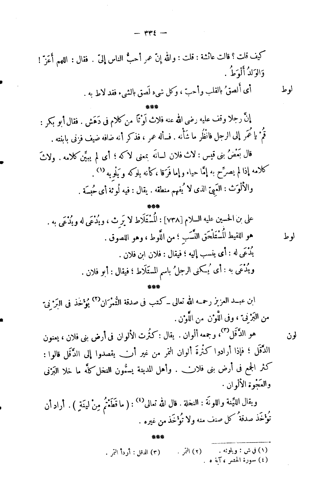 لوط كَيفَ قلت قَالَت عَائِشَة: قلت: وَالله إنّ عمر أحبُّ النَّاس إليَّ. فَقَالَ: اللَّهُمَّ أعزّ وَالْولد ألوطُ. أَي ألصق بِالْقَلْبِ وأحبّ وكل شَيْء لصق بالشَّيْء فقد لَاطَ بِهِ. إنَّ رجلا وقف عَلَيْهِ رَضِي الله عَنهُ فلاث لوثاً من كَلَام فِي دهش. فَقَالَ أَبُو بكر: قُم يَا عمر إِلَى الرجل فَانْظُر مَا شَأْنه. فَسَأَلَهُ عمر فَذكر أَنه ضافه ضيف فزنى بابنته. قَالَ بعض بني قيس: لاث فلَان لِسَانه بِمَعْنى لاكه أَي لم يبين كَلَامه. ولاث كَلَامه إِذا لم يصرِّح بِهِ إمَّا حَيَاء وَإِمَّا فرقا كَأَنَّهُ يلوكه ويلويه. والألوث: العييّ الَّذِي لَا يفهم مَنْطِقه. يُقَال: فِيهِ لوثة أَي حبسة.