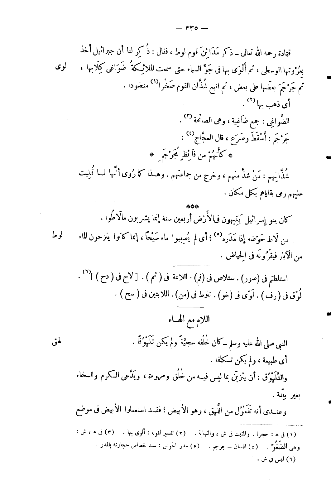 لوى قَتَادَة رَحمَه الله تَعَالَى ذكر مَدَائِن قوم لوط فَقَالَ: ذُكر لنا أَن جِبْرَائِيل أَخذ بعروتها الْوُسْطَى ثمَّ ألوى بهَا فِي جوِّ السَّمَاء حَتَّى سَمِعت الْمَلَائِكَة ضواغي كلابها ثمَّ جرجم بَعْضهَا على بعض ثمَّ اتبع شُذَّان الْقَوْم صخرا منضودا. أَي ذهب بهَا. الضواغي: جمع ضاغية وَهِي الصائحة. جرجم: أسقط وصرع قَالَ العجاج: ... كأَنهُمْ من فَائِظٍ مُجَرْجَمِ ... شذَّانهم: من شَذَّ مِنْهُم وَخرج من جَمَاعَتهمْ. وَهَذَا كَمَا روى أَنَّهَا لما قُلبت عَلَيْهِم رمى بقاياهم بِكُل مَكَان.