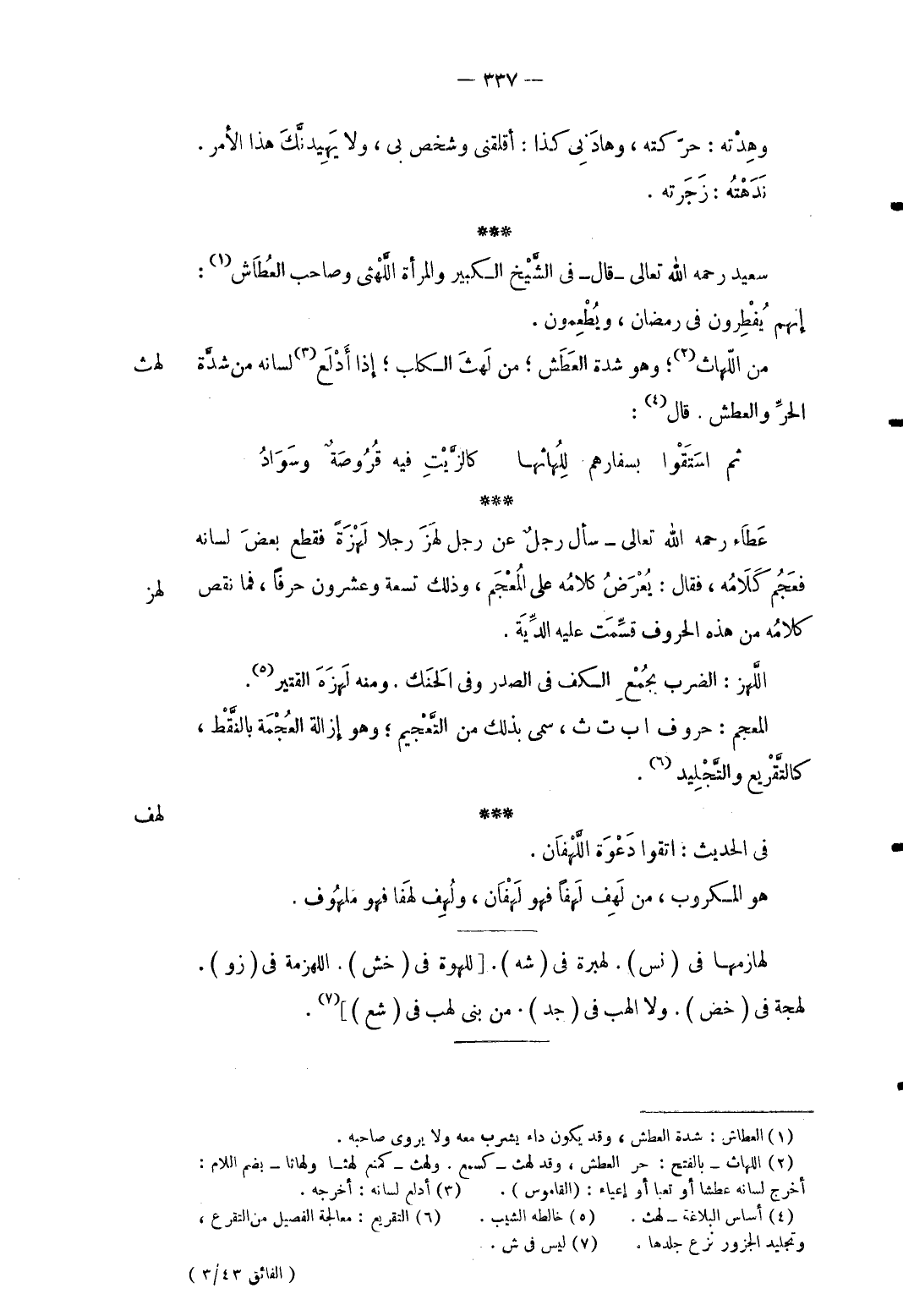 لهث سعيد رَحمَه الله تَعَالَى قَالَ فِي الشَّيْخ الْكَبِير وَالْمَرْأَة اللهثى وَصَاحب العطاش: إِنَّهُم يُفطرون فِي رَمَضَان ويُطعمون. من اللهاث وَهُوَ شدَّة الْعَطش من لهث الْكَلْب إِذا أدلع لِسَانه من شدَّة الْحر والعطش. قَالَ: ... ثمَّ استَقَوْا بسفارهم للهاثها ... كالزيت فِيهِ قروصة وَسَوَاد ...
