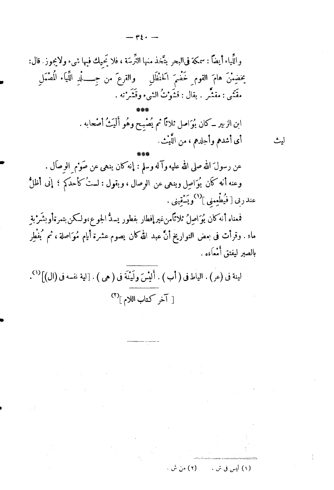 لَيْث ابْن الزبير كَانَ يواصل ثَلَاثًا ثمَّ يُصبح وَهُوَ أليث أَصْحَابه. أَي أَشَّدهم وأجلدهم من اللَّيْث. عَن رَسُول الله صلى الله عَلَيْهِ وَسلم: إِنَّه كَانَ يُنْهِي عَن صَوْم الْوِصَال. وَعنهُ أَنه كَانَ يواصل وَينْهى عَن الْوِصَال وَيَقُول: لست كأحدكم إِنِّي أظل عِنْد رَبِّي [فيطعمن] ي ويسقيني. فَمَعْنَاه أَنه كَانَ يواصل ثَلَاثًا من غير إفطار بفطور يسدُّ الْجُوع وَلَكِن بتمرة أَو بِشَربَة ماءٍ. وقرأت فِي بعض التواريخ أَن عبد الله كَانَ يَصُوم عشرَة أَيَّام مُوَاصلَة ثمَّ يفْطر بِالصبرِ ليفتق أمعاءه.