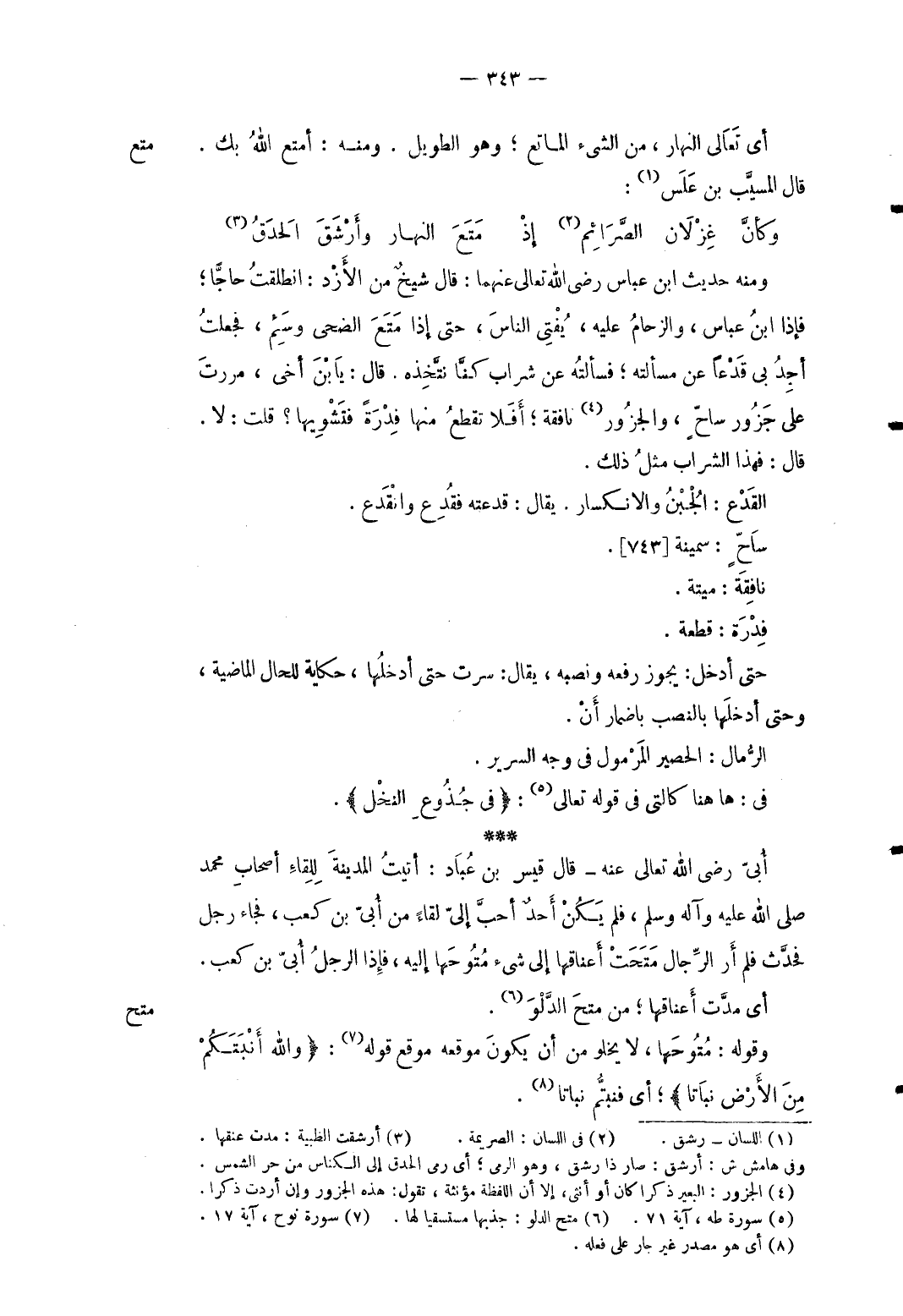 متع أَي تَعَالَى النَّهَار من الشَّيْء الماتع وَهُوَ الطَّوِيل. وَمِنْه: أمتع الله بك. قَالَ الْمسيب بن علس: ... وكأنَّ غِزْلاَن الصَّرَائِم إذْ ... مَتَعَ النَّهَار وأَرْشَقَ الحَدَقُ ... وَمِنْه حَدِيث ابْن عَبَّاس رَضِي الله تَعَالَى عَنْهُمَا: قَالَ شيخ من الأزد: انْطَلَقت حاجًّا فَإِذا ابْن عَبَّاس والزحام عَلَيْهِ يُفتي النَّاس حَتَّى إِذا متع الضُّحَى وسئم فَجعلت أجد بِي قدعاً عَن مَسْأَلته فَسَأَلته عَن شراب كنَّا نتَّخذه. قَالَ: يَابْنَ أخي مَرَرْت على جزور ساحّ وَالْجَزُور نافقة أَفلا تقطع مِنْهَا فدرة فتشويها قلت: لَا. قَالَ: فَهَذَا الشَّرَاب مثل ذَلِك. القدع: الجُبن والانكسار. يُقَال: قدعته فقُدع وانقدع. ساحٍّ: سَمِينَة. نافقة: ميتَة. فدرة: قِطْعَة. حَتَّى أَدخل: يجوز رَفعه ونصبه يُقَال: سرت حَتَّى أدخلها حِكَايَة للْحَال الْمَاضِيَة وَحَتَّى أدخلها بِالنّصب باضمار أَن. الرُّمال: الْحَصِير المرمول فِي وَجه السرير. فِي: هَا هُنَا كَالَّتِي فِي قَوْله تَعَالَى: {فِي جُذُوعِ النخْل}