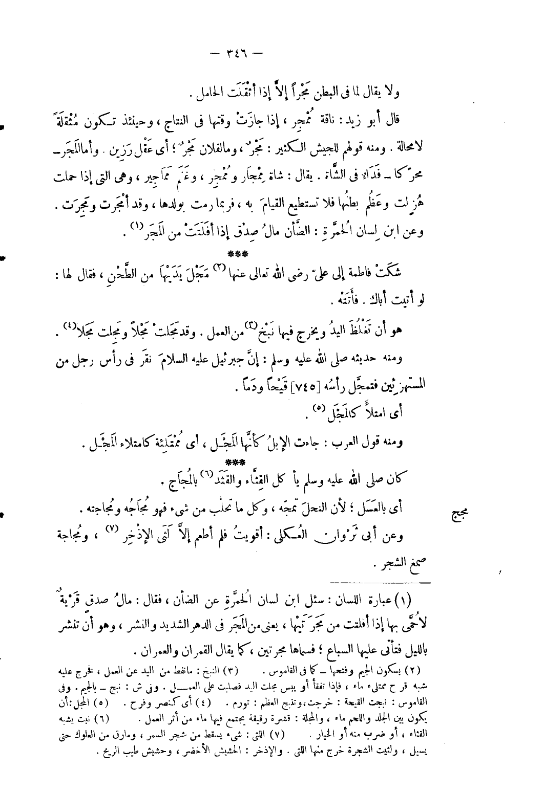 ولايقال لما فِي الْبَطن مجراً إلاَّ إِذا أثقلت الْحَامِل. قَالَ أَبُو زيد: نَاقَة ممجر إِذا جَازَت وَقتهَا فِي النِّتَاج وَحِينَئِذٍ تكون مثقلة لَا محَالة. وَمِنْه قَوْلهم للجيش الْكثير: مجرٌ وَمَا لفُلَان مجر أَي عقل رزين. وَأما اللمجر محركا فدَاء فِي الشَّاة. يُقَال: شَاة ممجار وممجر وغنم مماجير وَهِي الَّتِي إِذا حملت هزلت وَعظم بَطنهَا فَلَا تَسْتَطِيع الْقيام بِهِ فَرُبمَا رمت بِوَلَدِهَا وَقد أمجرت ومجرت. وَعَن ابْن لِسَان الْحمرَة: الضَّأْن مَال صدق إِذا أفلتت من المجر. شكت فَاطِمَة إِلَى عَليّ رَضِي الله تَعَالَى عَنْهَا مجل يَديهَا من الطَّحْن فَقَالَ لَهَا: لَو أتيت أَبَاك فَأَتَتْهُ. هُوَ أَن تغلظ الْيَد وَيخرج فِيهَا نبخ من الْعَمَل. وَقد مجلت مجلا ومجلت مجلا. وَمِنْه حَدِيثه صلى الله عَلَيْهِ وَسلم: إِن جبرئيل عَلَيْهِ السَّلَام نقر فِي رَأس رجل من الْمُسْتَهْزِئِينَ فتمجَّل رَأسه قَيْحا ودماً. أَي امْتَلَأَ كالمجل. وَمِنْه قَول الْعَرَب: جَاءَت الْإِبِل كَأَنَّهَا المجل أَي ممتلئة كامتلاء المجل.