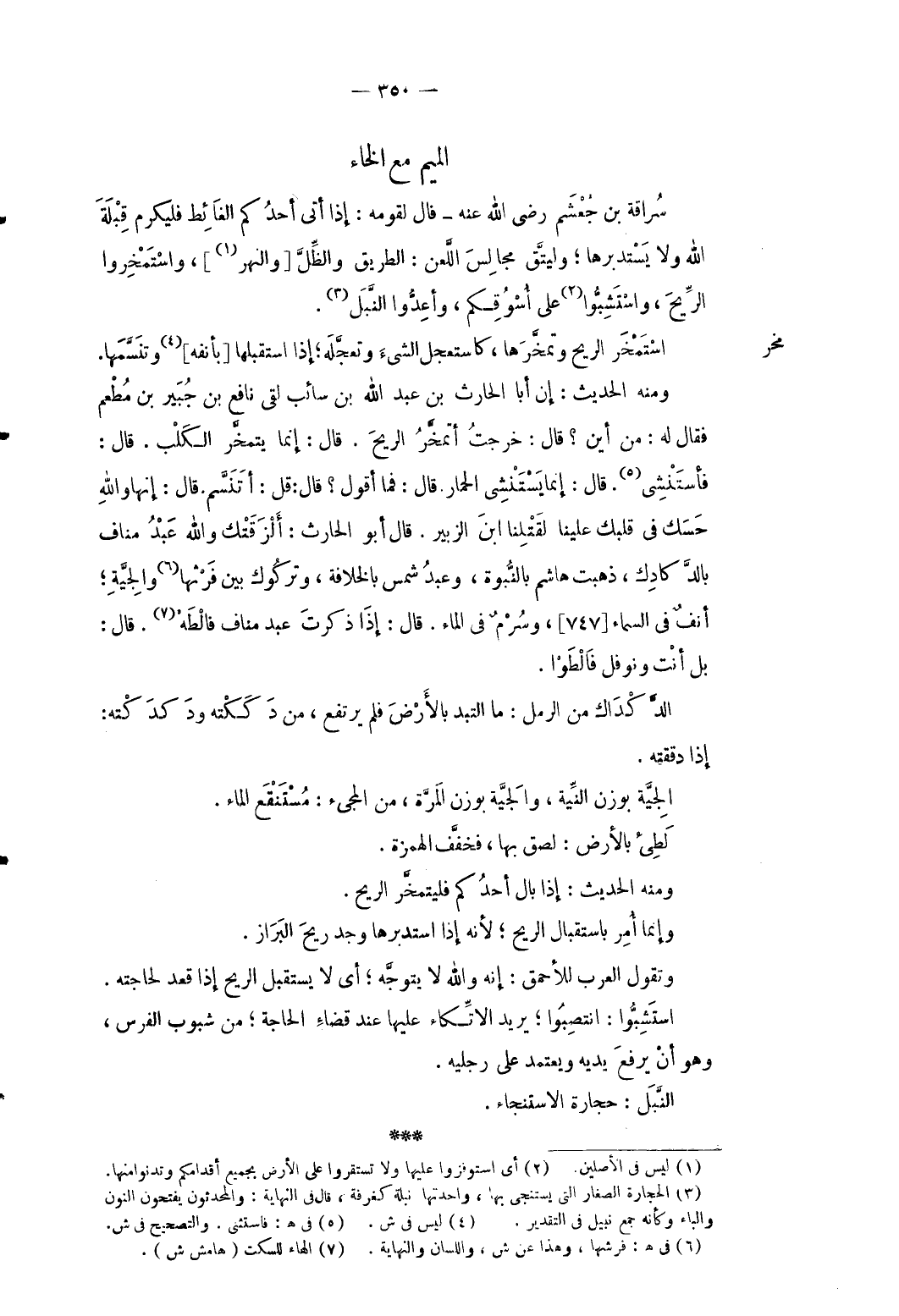 مخر سراقَة بن جعْشم رَضِي الله عَنهُ قَالَ لِقَوْمِهِ: إِذا أَتَى أحدكُم الْغَائِط فَليُكرم قبْلَة الله وَلَا يستدبرها وليتق مجَالِس اللَّعْن: الطَّرِيق والظل وَالنّهر واستمخروا الرّيح واستشبوا على أسوقكم وَأَعدُّوا النَّبَل. استمخر الرّيح وتمخرها كاستعجل الشَّيْء وتعجله إِذا اسْتَقْبلهَا بِأَنْفِهِ وتنسمها. وَمِنْه الحَدِيث: إِن أَبَا الْحَارِث بن عبد الله بن سائب لقى نَافِع بن جُبَير بن مطعم فَقَالَ لَهُ: من أَيْن قَالَ: خرجت أتمخر الرّيح. قَالَ: إِنَّمَا يتمخر الْكَلْب. قَالَ: فأستثنشي. قَالَ: إِنَّمَا يستنشي الْحمار. قَالَ: فَمَا أَقُول قَالَ: قل أتنسم. قَالَ: إِنَّهَا وَالله حسك فِي قَلْبك علينا لقتلنا ابْن الزبير. قَالَ أَبُو الْحَارِث: ألزقتك وَالله عبد منَاف بالد كادك ذهب هَاشم بِالنُّبُوَّةِ وعبدشمس بالخلافة وَتَرَكُوك بَين فرثها والجيَّة أنفٌ فِي السَّمَاء وسرم فِي المَاء قَالَ: إِذا ذكرت عبد منَاف فالطه. قَالَ: بل أَنْت وَنَوْفَل فالطوا. الدكداك من الرمل: مَا التبد بِالْأَرْضِ فَلم يرْتَفع من دككته ودكدكته: إِذا دققته. الجيَّة بِوَزْن النِّيَّة والجية بِوَزْن المرَّة من الْمَجِيء: مستنقع المَاء. لطئ بِالْأَرْضِ: لصق بهَا فَخفف الْهمزَة. وَمِنْه الحَدِيث: إِذا بَال أحدكُم فليتمخر الرّيح. وَإِنَّمَا أَمر باستقبال الرّيح لِأَنَّهُ إِذا استدبرها وجد ريح البرَاز. وَتقول الْعَرَب للأحمق: إِنَّه وَالله لَا يتوجَّه أَي لَا يسْتَقْبل الرّيح إِذا قعد لِحَاجَتِهِ. استشبوا: انتصبوا يُرِيد الاتِّكاء عَلَيْهَا عِنْد قَضَاء الْحَاجة من شبوب الْفرس وَهُوَ أَن يرفع يَدَيْهِ ويعتمد عل رجلَيْهِ. النبل: حِجَارَة الِاسْتِنْجَاء.