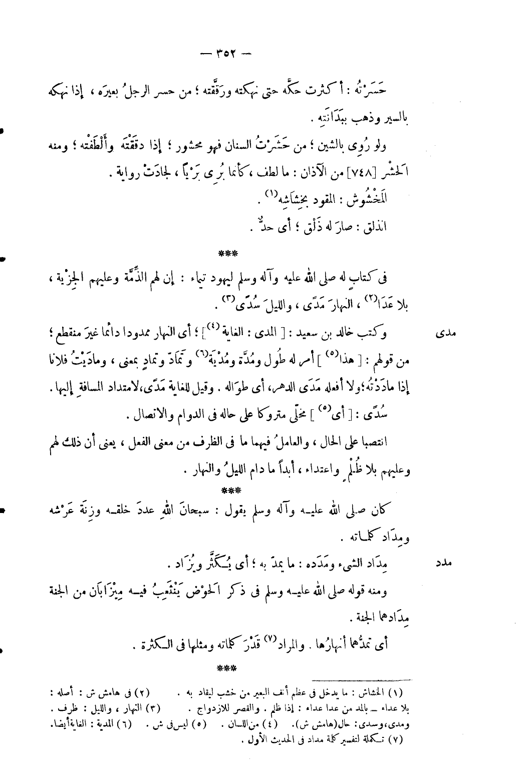 حسرته: أكثرت حكَّه حَتَّى نهكته ورقَّقته من حسر الرجل بعيره إِذا نهكه بالسير وَذهب ببدانته. وَلَو روى بالشين من حشرت السنان فَهُوَ محشور إِذا دققته وألطفته وَمِنْه الْحَشْر من الآذان: مَا لطف كَأَنَّمَا بري برياً لجادت رِوَايَة. المخشوش: المقود بخشاشه. انذلق: صَار لَهُ ذلق أَي حد.
