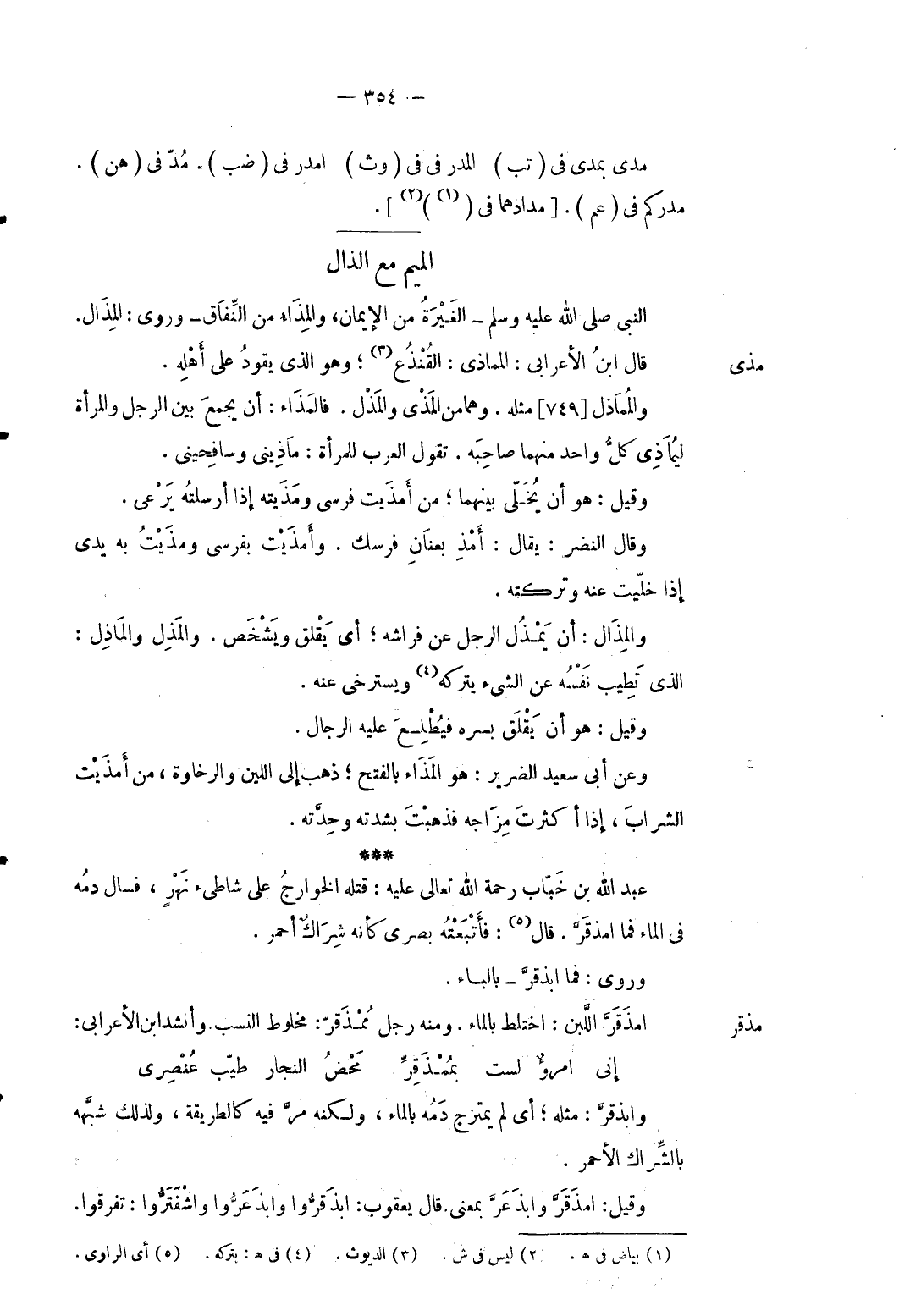 مذقر عبد الله بن خباب رَحمَه الله تَعَالَى عَلَيْهِ: قَتله الْخَوَارِج على شاطئ نهر فَسَالَ دَمه فِي المَال فَمَا امذقرَّ. قَالَ: فَأَتْبَعته بَصرِي كَأَنَّهُ شِرَاك أَحْمَر. وروى: فَمَا ابذقرَّ بِالْبَاء. امذقرَّ اللَّبن: اخْتَلَط بِالْمَاءِ. رجل وَمِنْه ممذقر: مخلوط النّسَب وَأنْشد ابْن الْأَعرَابِي: ... إِنِّي امرو لست بمُمْذَقِرِّ ... مَحْضُ النجار طيّب عُنْصِري ... وابذقرَّ: مثله أَي لم يمتزج دَمه بِالْمَاءِ وَلكنه مرَّ فِيهِ كالطريقة وَلذَلِك شبهه بالشراك الْأَحْمَر. وَقيل: امذقرَّ وابذعرَّ بِمَعْنى قَالَ يَعْقُوب: ابذقرُّوا وابذعروا واشفتروا: تفَرقُوا.