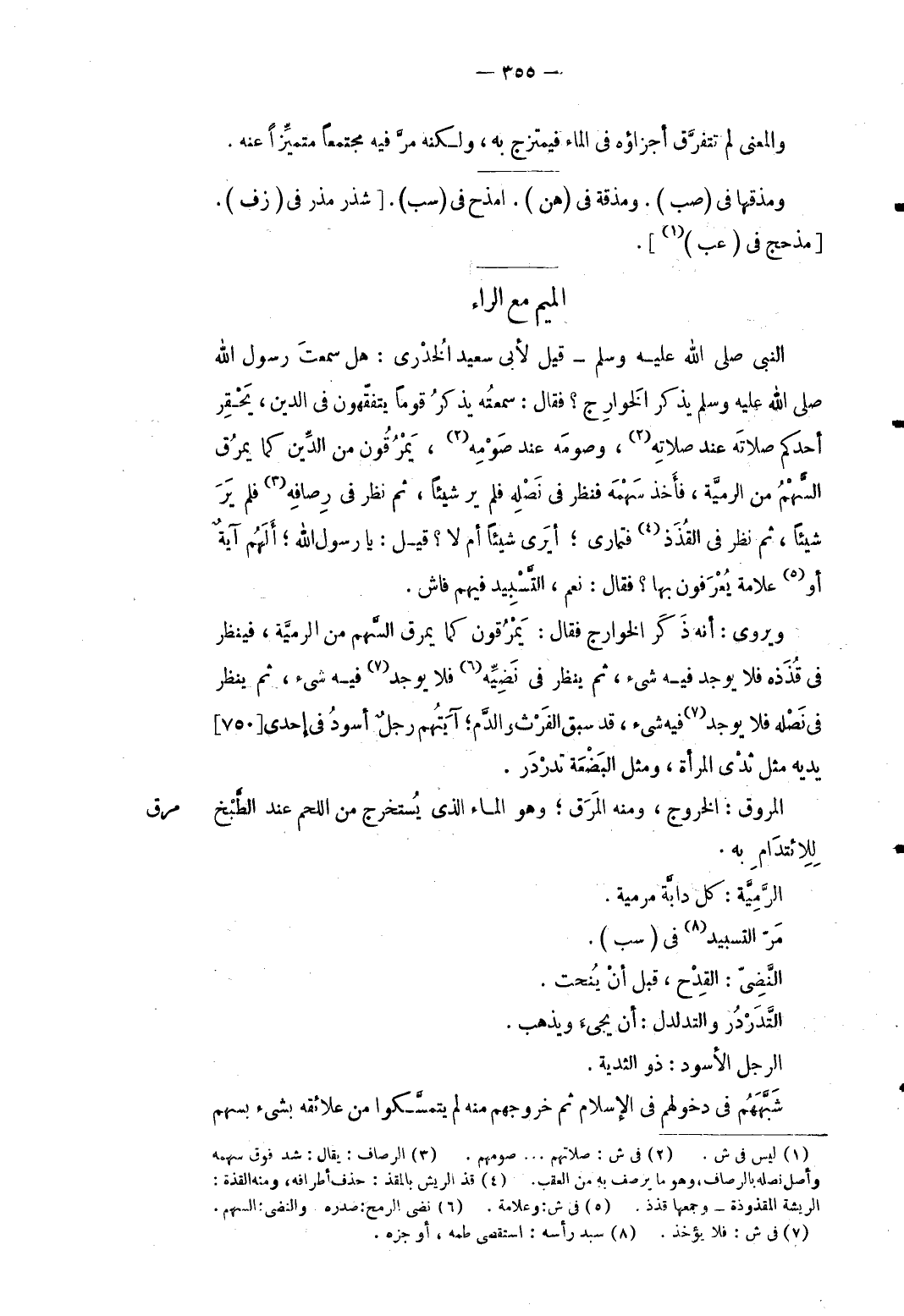 مرق النَّبِي صلى الله عَلَيْهِ وَسلم قيل لأبي سعيد الْخُدْرِيّ: هَل سَمِعت رَسُول الله صلى الله عَلَيْهِ وَسلم يذكر الْخَوَارِج فَقَالَ: سمعته يذكر قوما يتفقهون فِي الدّين يحقر أحدكُم صلَاته عِنْد صلَاته وصومه عِنْد صَوْمه يَمْرُقُونَ من الدّين كَمَا يَمْرُق السهْم من الرميَّة فَأخذ سَهْمه فَنظر فِي نصله فَلم ير شَيْئا ثمَّ نظر فِي رصافه فَلم ير شَيْئا ثمَّ نظر فِي القذذ فتمارى أيرى شَيْئا أم لَا قيل: يَا رَسُول الله ألهم آيَة أَو عَلامَة يعْرفُونَ بهَا فَقَالَ: نعم التسبيد فيهم فَاش. ويروى: أَنه ذكر الْخَوَارِج فَقَالَ: يَمْرُقُونَ كَمَا يَمْرُق السهْم من الرَّمية فَينْظر فِي قذذه فَلَا يُوجد فِيهِ شَيْء ثمَّ ينظر فِي نضيِّه فَلَا يُوجد فِيهِ شَيْء ثمَّ ينظر فِي نصله فَلَا يُوجد فِيهِ شَيْء فد سبق الفرث وَالدَّم آيَتهم رجل أسود فِي إِحْدَى يَدَيْهِ مثل ثدي الْمَرْأَة وَمثل الْبضْعَة تدَرْدر. المروق: الْخُرُوج وَمِنْه المرق وَهُوَ المَاء الَّذِي يسْتَخْرج من اللَّحْم عِنْد الطَّبْخ للائتدام بِهِ. الرَّميَّة: كل دَابَّة مرمية. مرّ التسبيد فِي (سبّ) . النَّضي: الْقدح قبل أَن ينحت. التَّدردر والتدلدل: أَن يَجِيء وَيذْهب. الرجل الْأسود: ذُو الثدية: شبههم فِي دُخُولهمْ فِي الإسم ثمَّ خُرُوجهمْ مِنْهُ لم يَتَمَسَّكُوا من علائقه بِشَيْء بِسَهْم