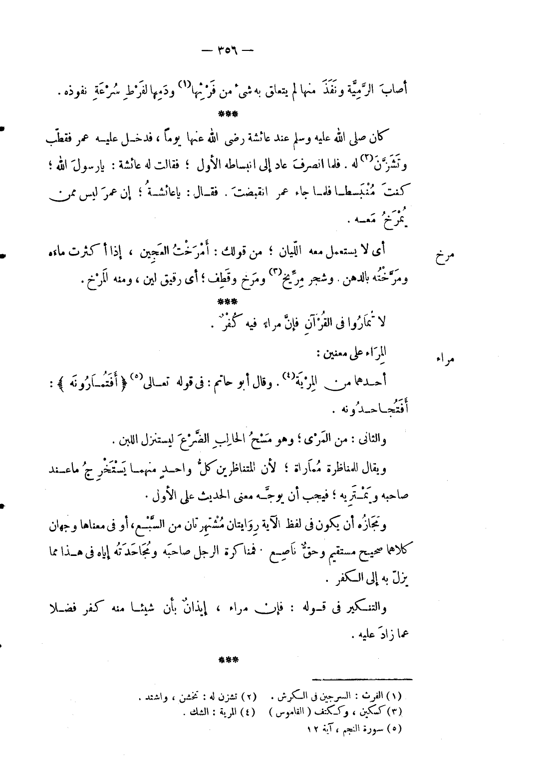 مراء لَا تماروا فِي الْقُرْآن فَإِن مراء فِيهِ كفرٌ. المراء على معنين: أَحدهمَا من المرية. وَقَالَ أَبُو حَاتِم: فِي قَوْله تَعَالَى: {أَفَتُمارُونَه} أفتجاحدونه. وَالثَّانِي: من المري وهومسح الحالب الضَّرع ليستنزل اللَّبن. وَيُقَال للمناظرة مماراة لِأَن المتناظرين كلُّ واحدٍ مِنْهُمَا يسْتَخْرج مَا عِنْد صَاحبه ويمتريه فَيجب أَن يُوَجه معنى الحَدِيث على الأول. ومجازه أَن يكون فِي لفظ الْآيَة رِوَايَتَانِ مشتهرتان من السَّبع أَو فِي مَعْنَاهَا وَجْهَان كِلَاهُمَا صَحِيح مُسْتَقِيم وحقٌّ ناصع. فمناكرة الرجل صاحيه ومجاحدته إِيَّاه فِي هَذَا مِمَّا يزل بِهِ إِلَى الْكفْر. والتنكير فِي قَوْله: فَإِن مراء إيذانٌ بِأَن شَيْئا مِنْهُ كفر فضلا عَمَّا زَاد عَلَيْهِ.