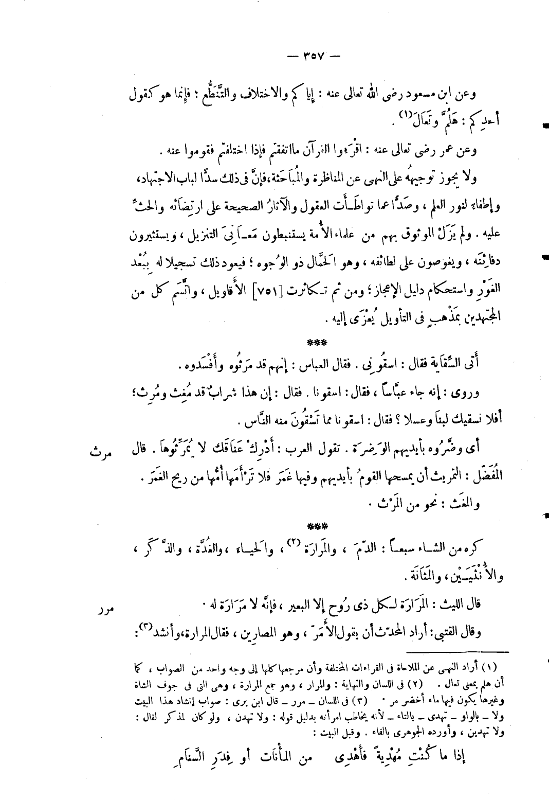 وَعَن ابْن مَسْعُود رَضِي الله تَعَالَى عَنهُ: إيَّاكُمْ وَالِاخْتِلَاف والتنطع فَإِنَّمَا هُوَ كَقَوْل أحدكُم: هَلُمَّ وتعال. وَعَن عمر رَضِي الله تَعَالَى عَنهُ: اقْرَءُوا الْقُرْآن مَا اتفقتم فَإِذا اختلفتم فَقومُوا عَنهُ. وَلَا يجوز تَوْجِيهه على النَّهْي عَن المناظرة والمباحثة فإنَّ فِي ذَلِك سدًّا لباب الِاجْتِهَاد وإطفاءً لنُور الْعلم وصدًّا عَمَّا تواطأت الْعُقُول والْآثَار الصَّحِيحَة على ارتضائه والحثِّ عَلَيْهِ. وَلم يزل الموثوق بهم من عُلَمَاء الْأمة يستنبطون مَعَاني التَّنْزِيل ويستثيرون دفائنه ويغوصون على لطائفه وَهُوَ الحمَّال ذُو الْوُجُوه فَيَعُود ذَلِك تسجيلا لَهُ ببعد الْغَوْر واستحكام دَلِيل الإعجاز وَمن ثمَّ تكاثرت الْأَقَاوِيل واتَّسم كل من الْمُجْتَهدين بِمذهب فِي التَّأْوِيل يعزى إِلَيْهِ.