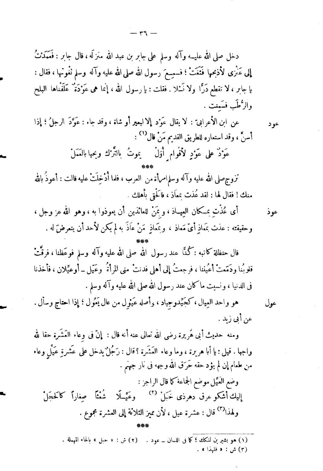 عود عَن ابْن الْأَعرَابِي لَا يُقَال عود إِلَّا لبعير أَو شَاة وَقد جَاءَ: عود الرجل إِذا أسن وَقد استعاره للطريق الْقَدِيم من قَالَ ... عَوْدٌ على عَوْدٍ لأقْوامٍ أُوَلْ ... يموتُ بِالتّرْكِ ويحيا بِالْعَمَلِ ...