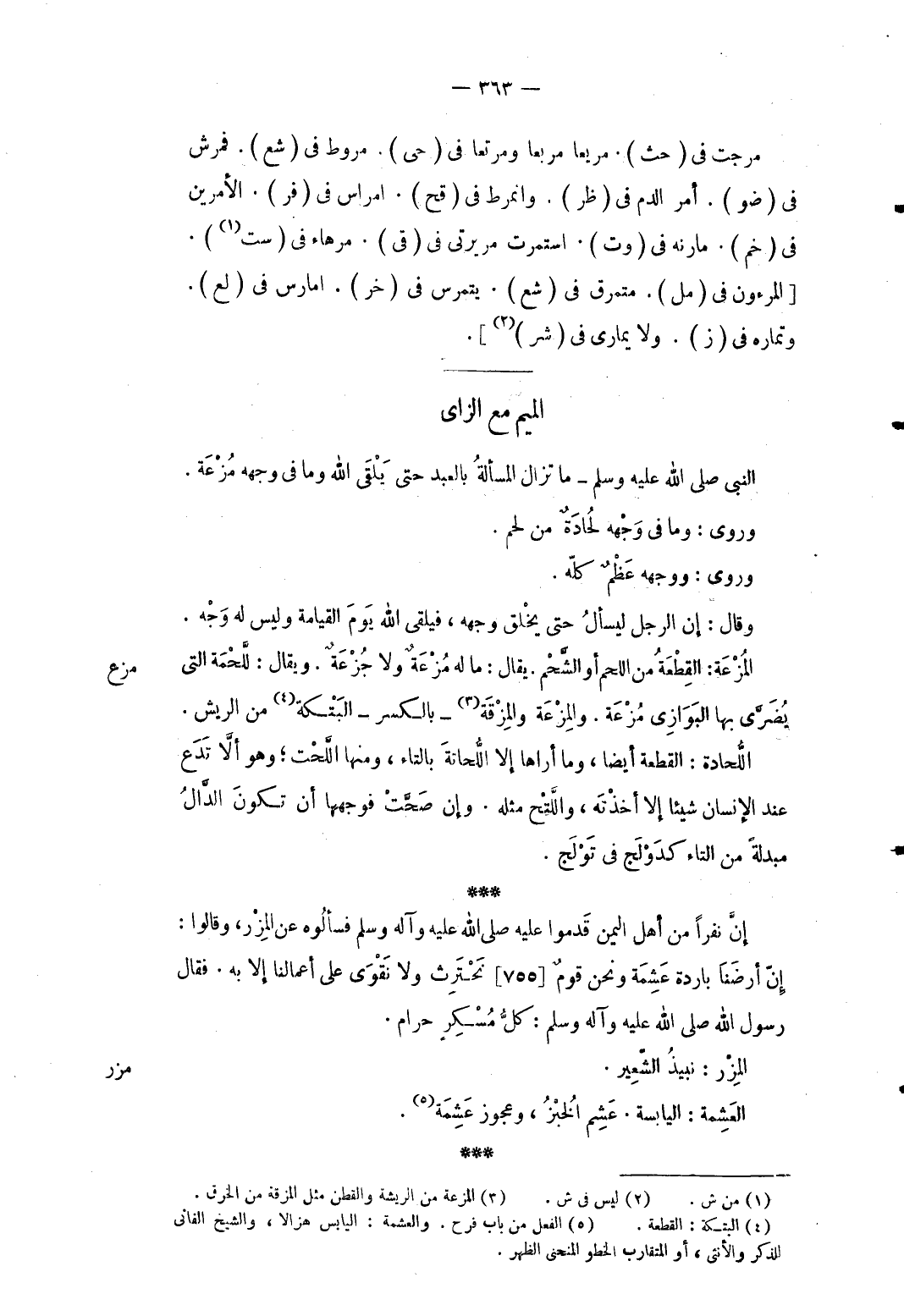 مزر إِن نَفرا من أهل الْيمن قدمُوا عَلَيْهِ صلى الله عَلَيْهِ وَسلم فَسَأَلُوهُ عَن المزر وَقَالُوا: إِن أَرْضنَا بَارِدَة عشمة وَنحن قومٌ نحترث وَلَا نقوى على أَعمالنَا إِلَّا بِهِ. فَقَالَ رَسُول الله صلى الله عَلَيْهِ وَسلم: كلُّ مُسكر حرَام. المزر: نَبِيذ الشّعير. العشمة: الْيَابِسَة. عشم الْخبز وعجوز عشمة.